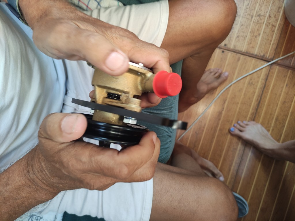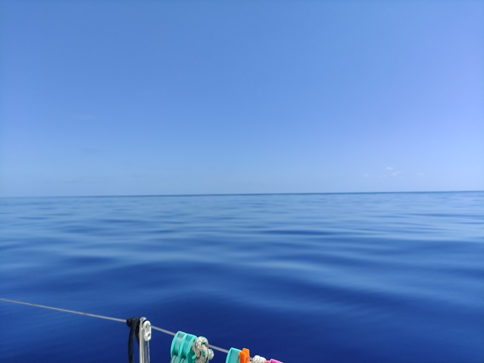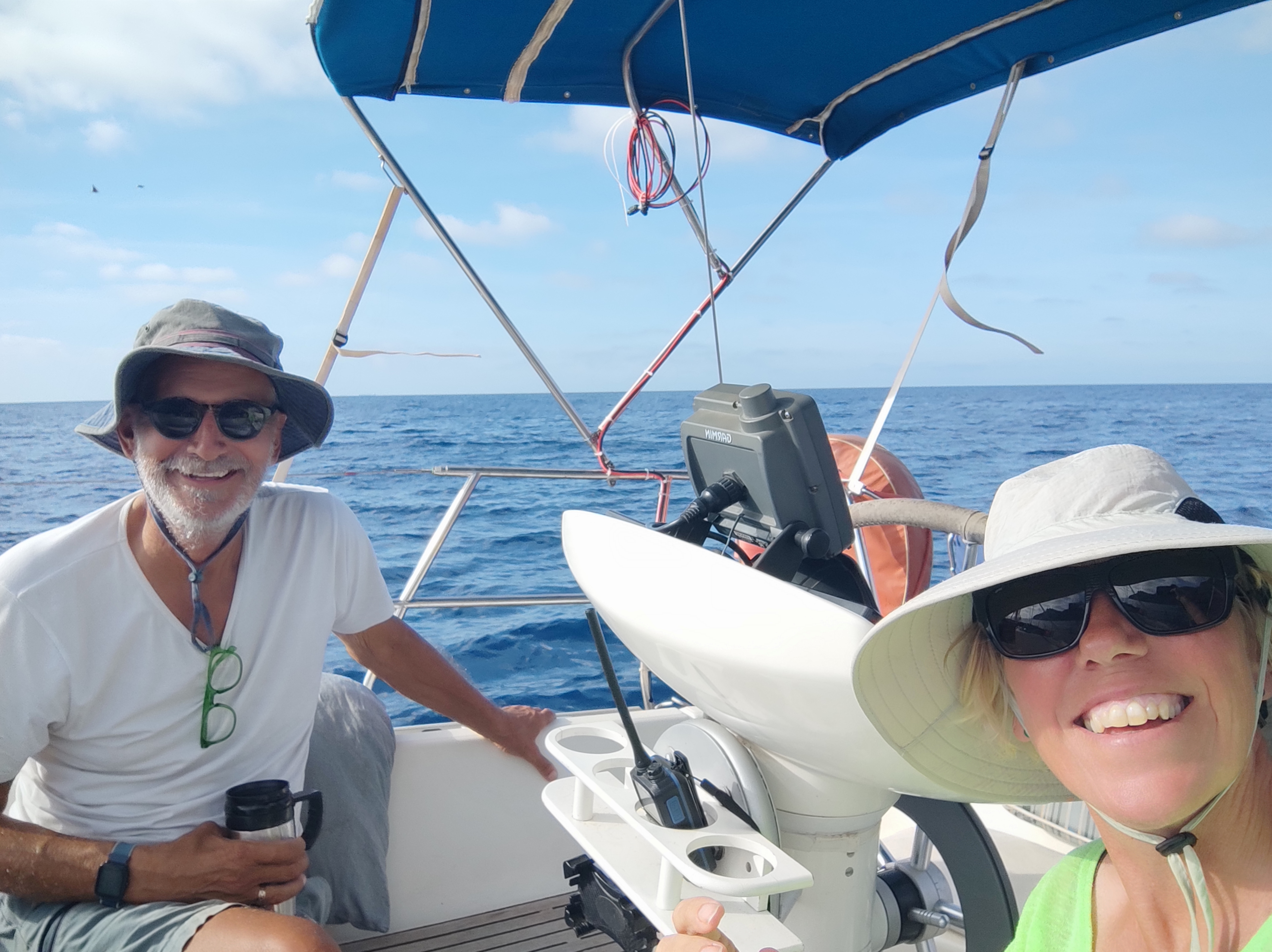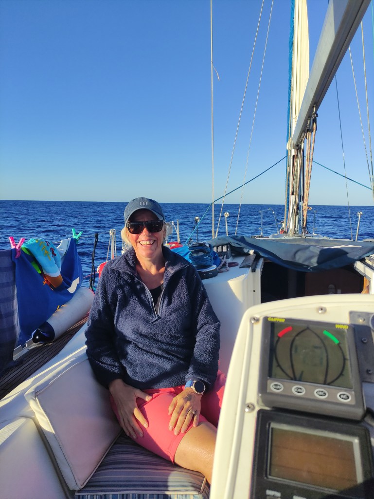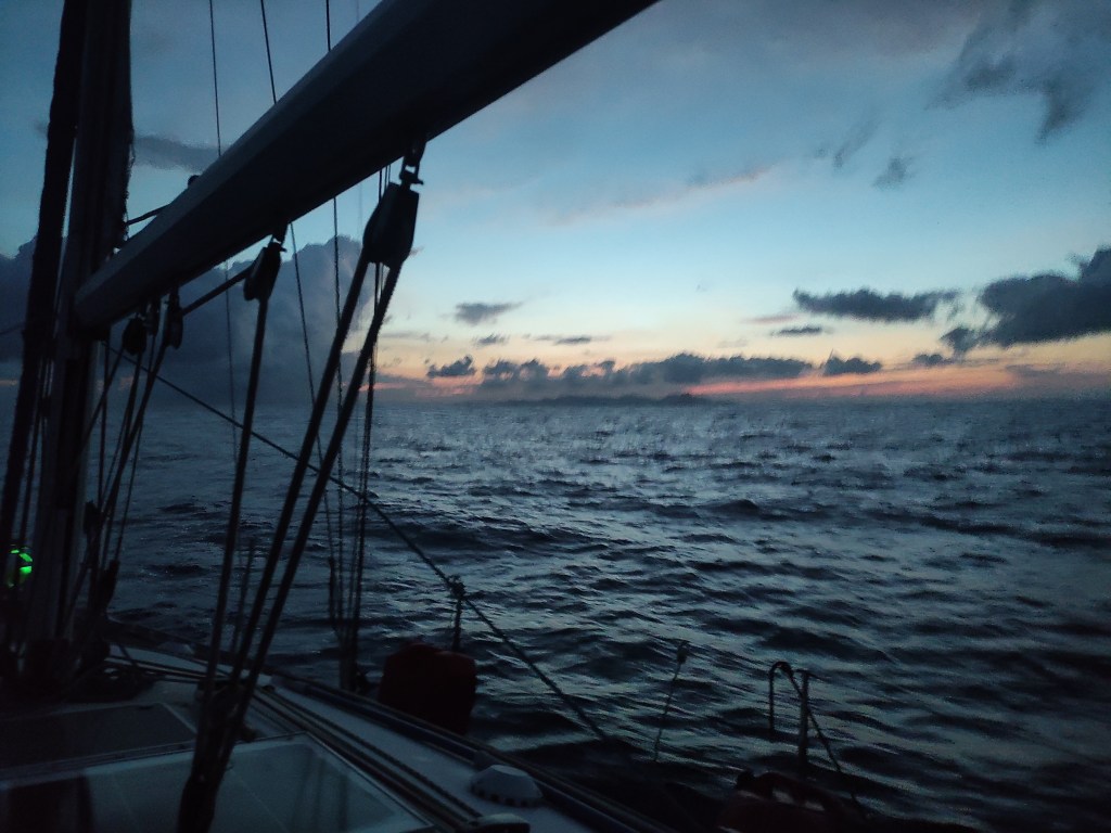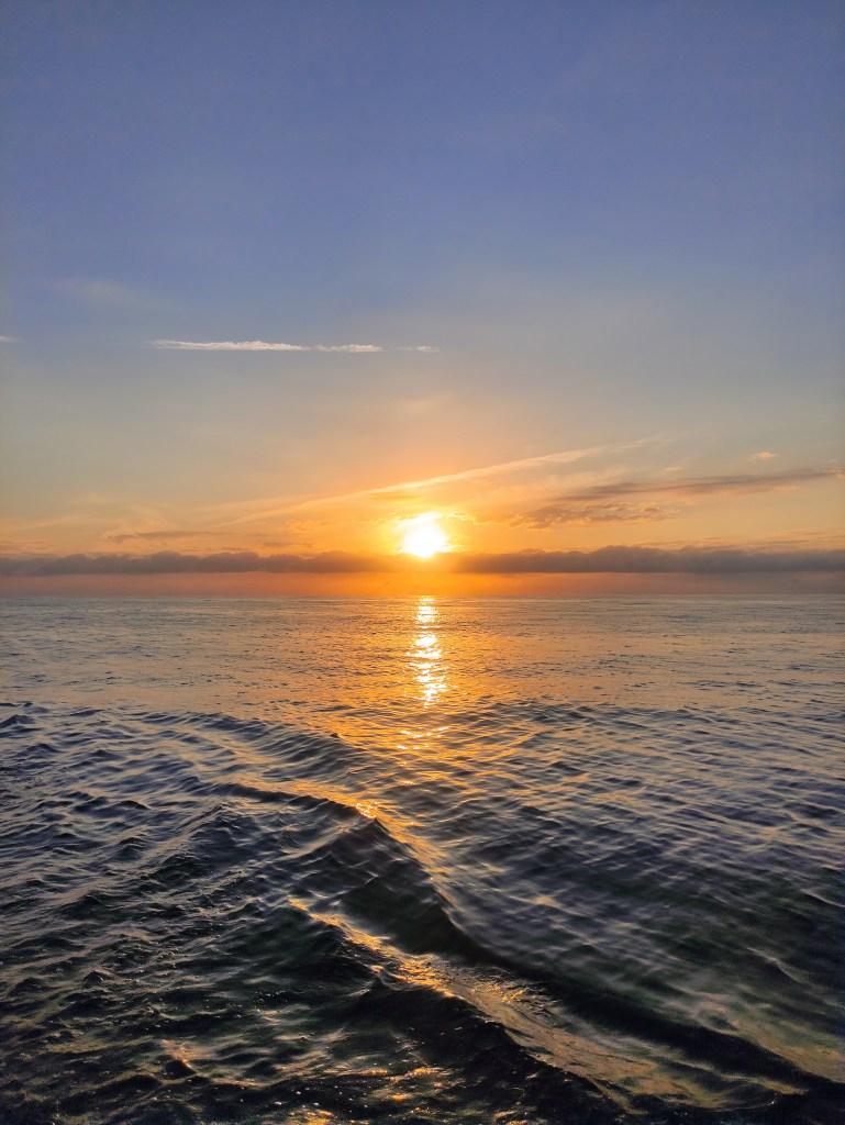The morning brought a stunning dawn and a serious discussion as we had slowed down significantly during Skipper Nigel’s early morning shift. We weren’t sure if it was the sea state working against us (although that seemed very unlikely) or that we had picked something up around the propeller. We could hear no vibration so we were very puzzled – when it was properly light we slowed down and put her in reverse – sure enough a plastic bag floated out behind the boat – how frustrating. Unfortunately we didn’t pick up much speed but as there was no evidence of vibration or any strange noises we continued on our journey.
