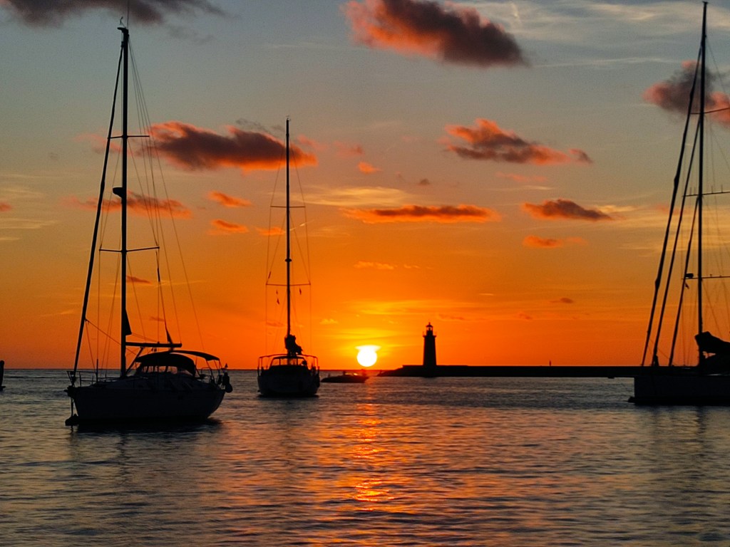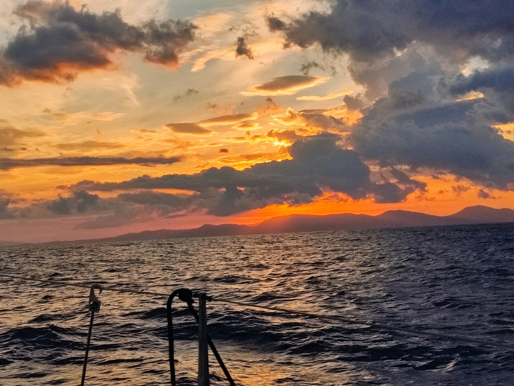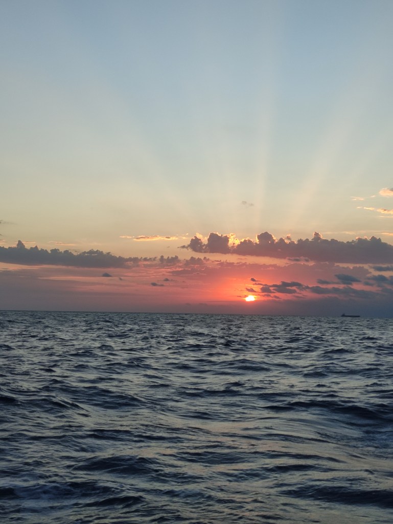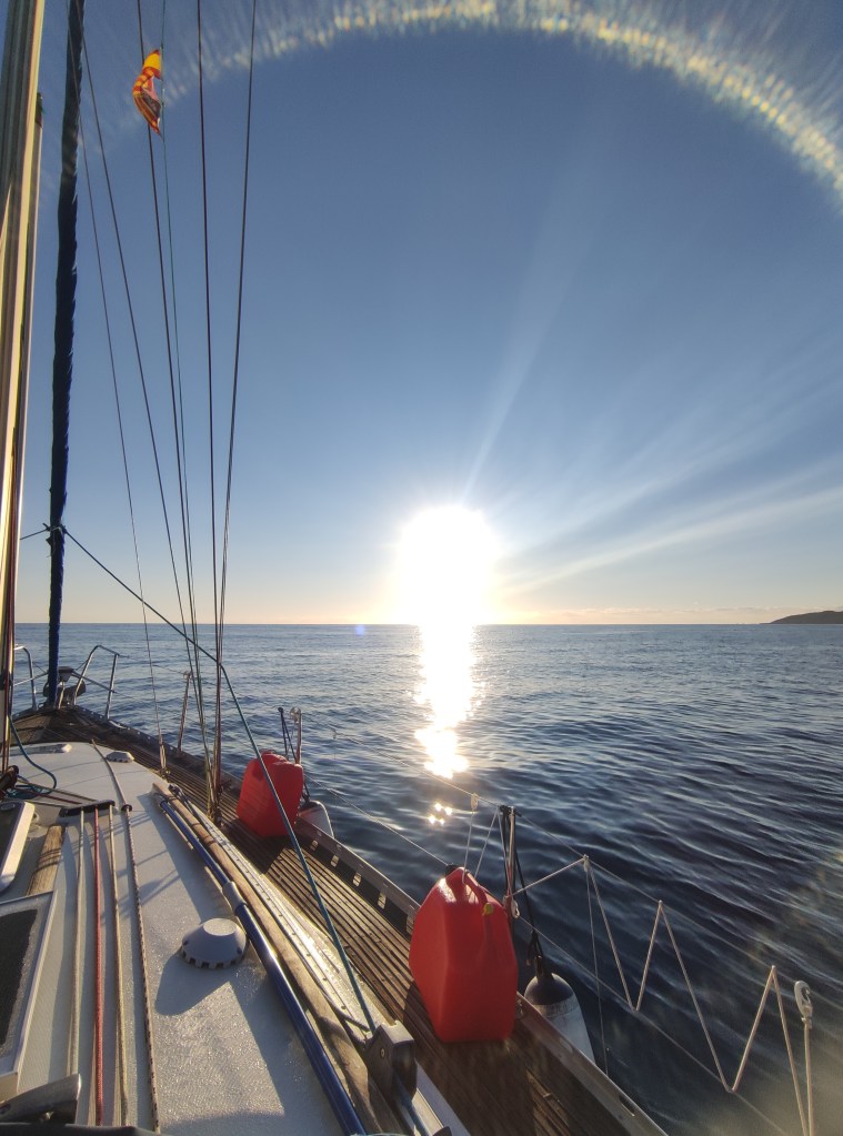 We were rewarded at the end of day one with a lovely sunset and fairly calm seas a great end to a brilliant day …… only not really the end since only one of us was resting at a time , the other was vigilantly looking for ships. It’s a bit like driving in the dark you can see them easily – only at sea you need to calculate their direction (from the shape and color of the lights) and then how far away they will pass you. This can get tricky when you’re tired so a couple of times we each called the other for a second opinion and we made it through the shipping lanes taking goods from the Gibraltar straights through to the Suez canal.