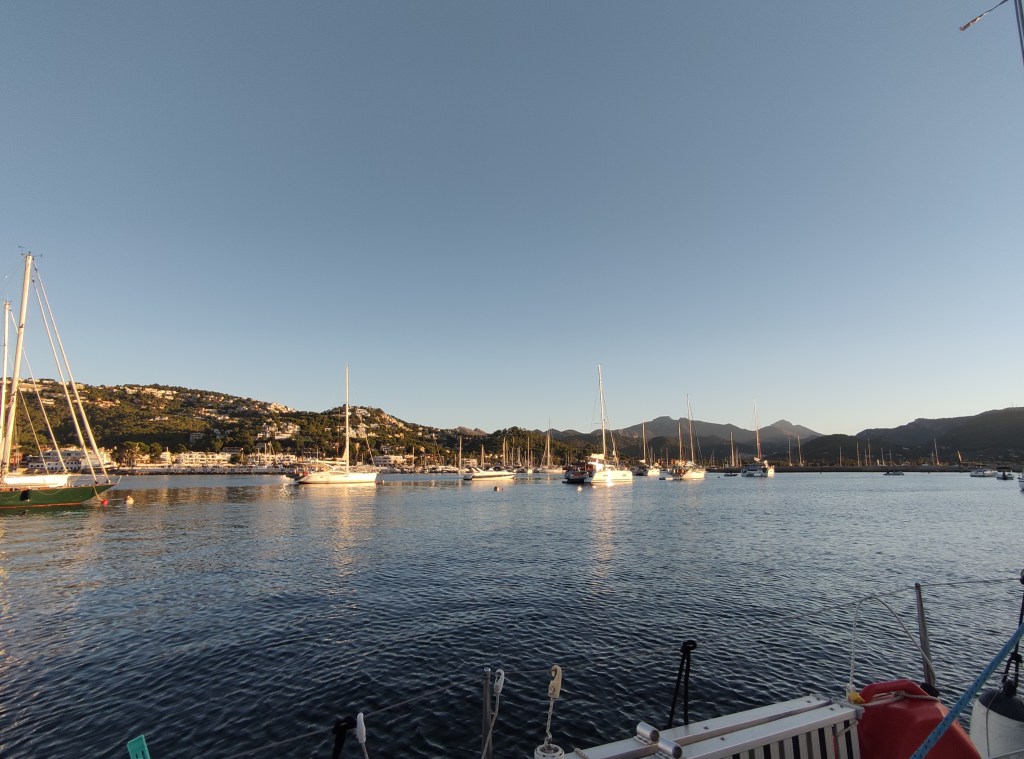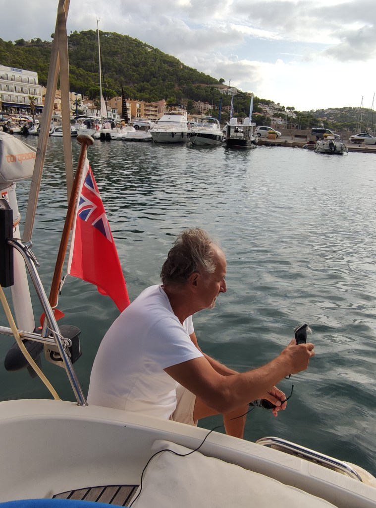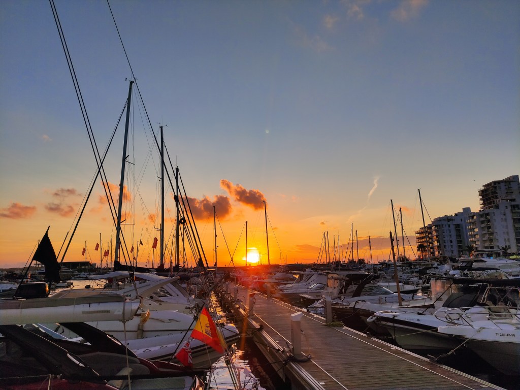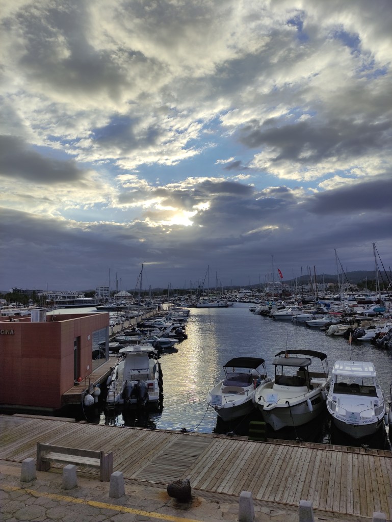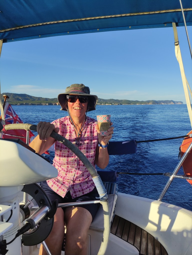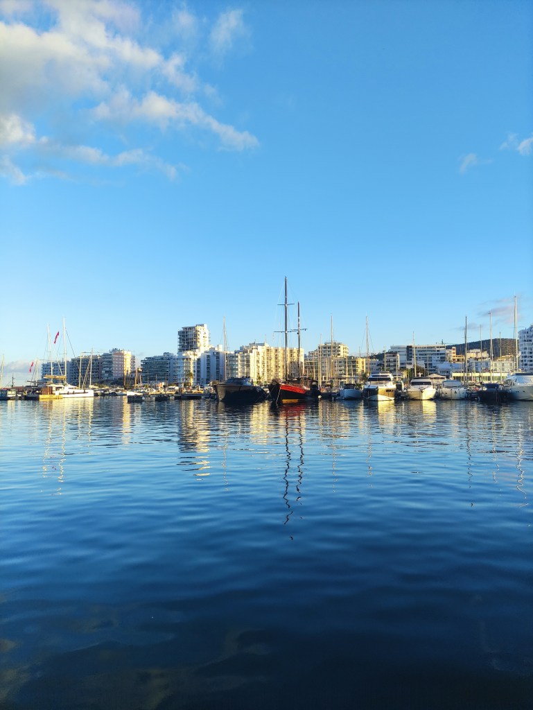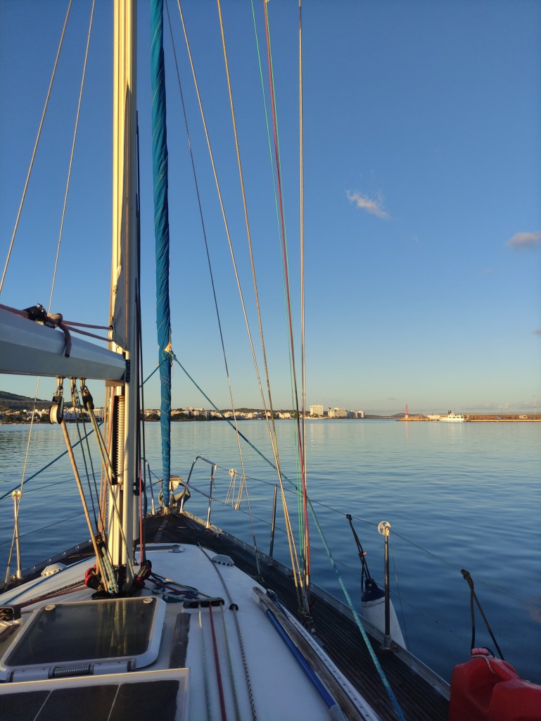 We rose before dawn with a yawn – first job of the day, check the weather forecast…..it was a go for the crossing back to Spain! and more than that, it was reasonable to go all the way back to Cartagena. When looking at these things we always have to consider the days ahead and we knew if we took the shorter route back to the Costa Blanca we could potentially be held up for quite some time with adverse wind and swell for the final journey back to Cartagena. So, as per usual we set out with a plan, and a double contingency – once we got out of the extremely sheltered San Antonio bay we would see how the sea state was (our main worry was the swell). If it was too bad to leave the islands we would head to Formentera. If It was too bad for the direction of Cartagena we would take the shorter route and if all was good we would aim to get back to our old berth in one long sail. First light saw us dropping the key to the pontoon gate back in the letterbox, leaving a little note for our boat twin neighbour Alex and unplugging the electric supply. Then it was a case of slipping the lines (untying the ropes and pulling them back on board) whilst Skipper Nigel reversed us out of our space and onwards into the bay. We could immediately tell the conditions were much, much better than the previous day and felt cautiously optimistic for the day ahead.