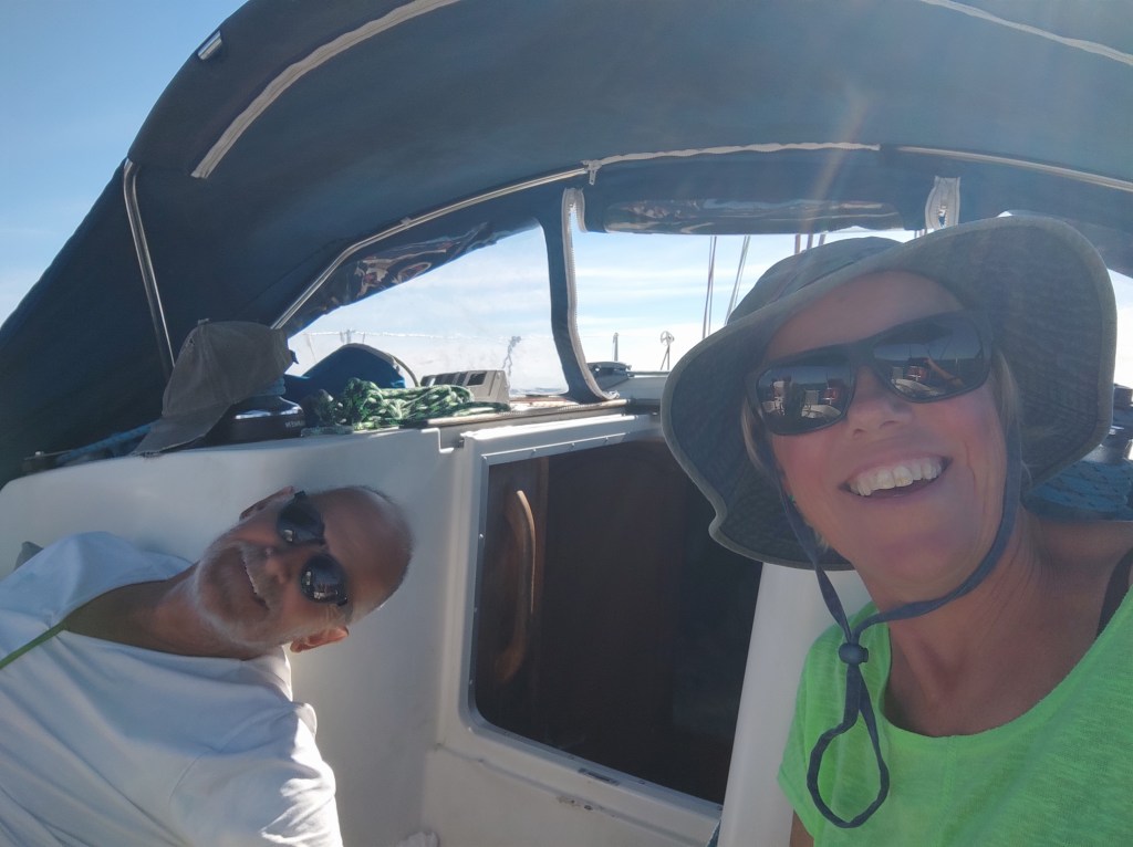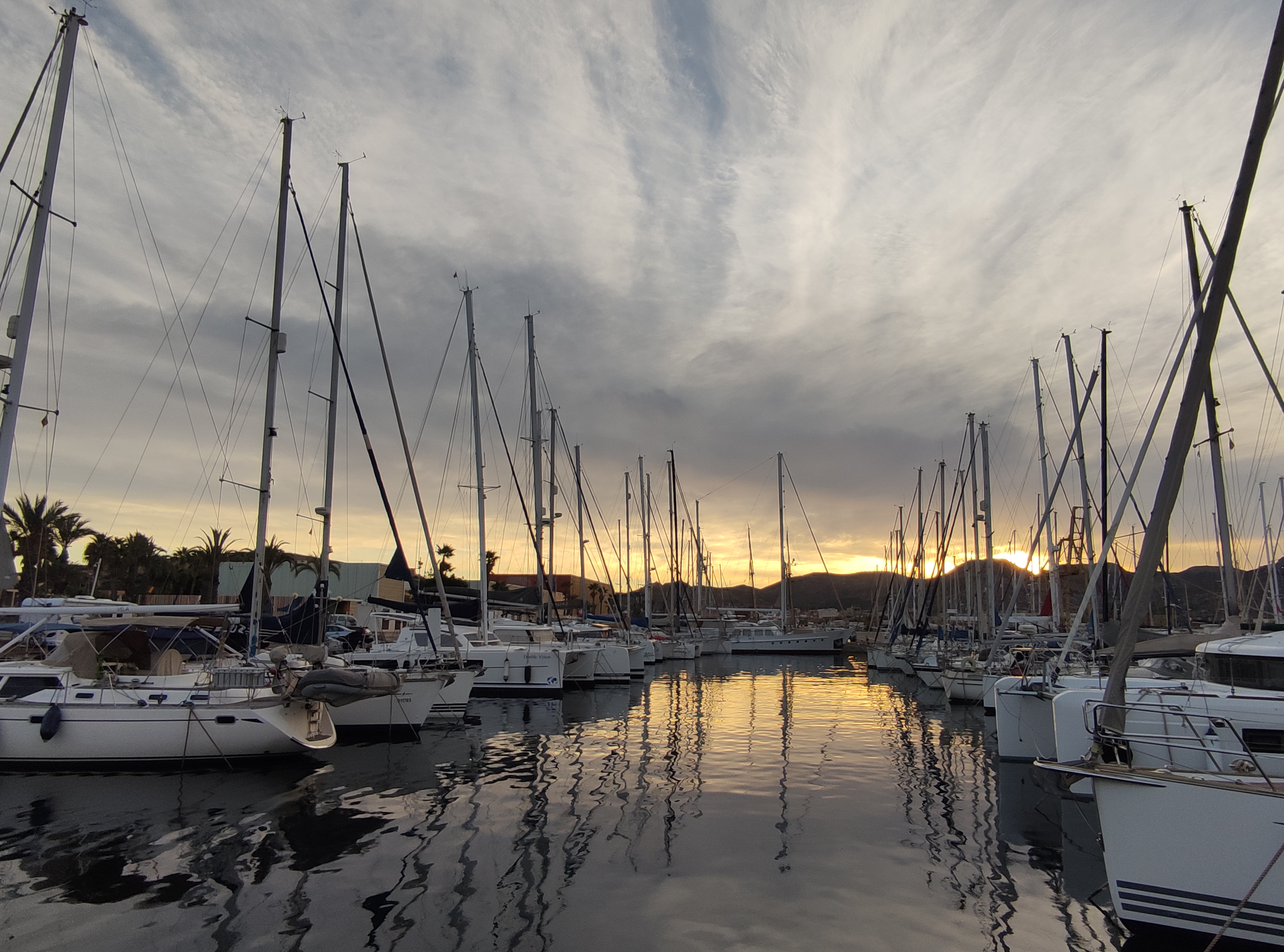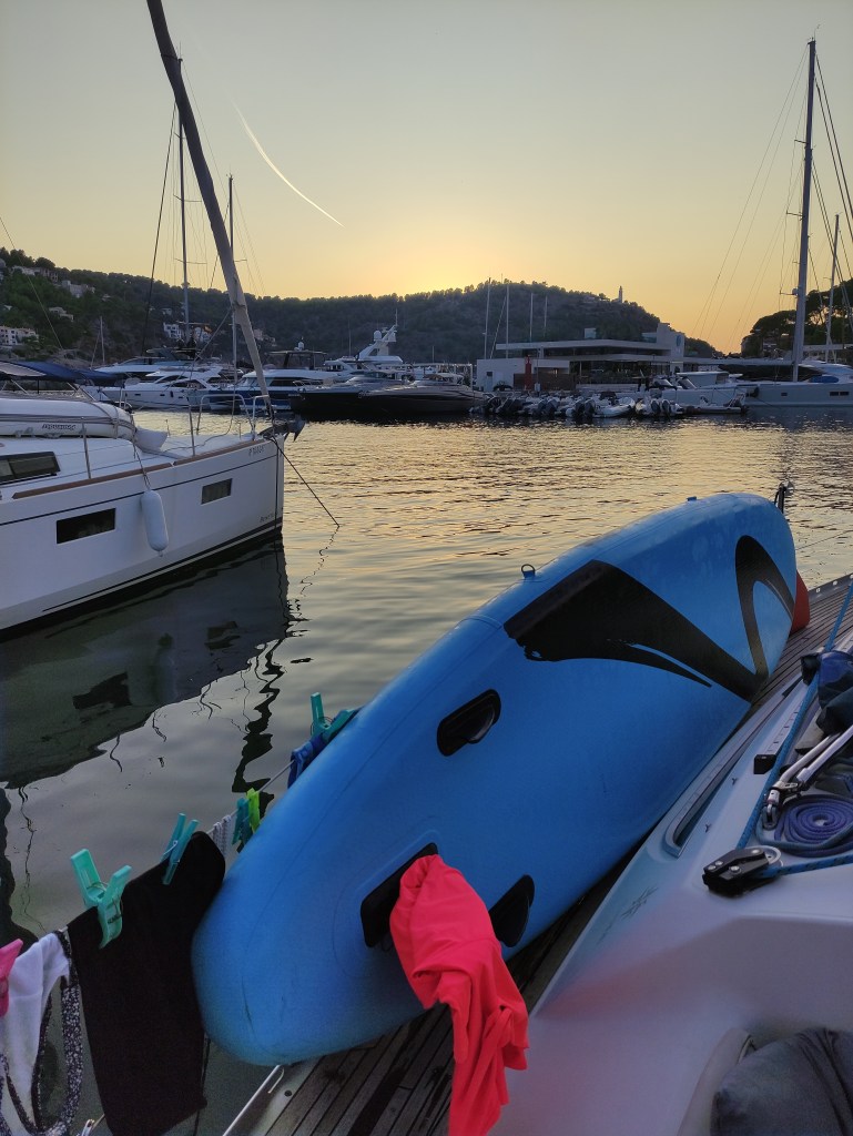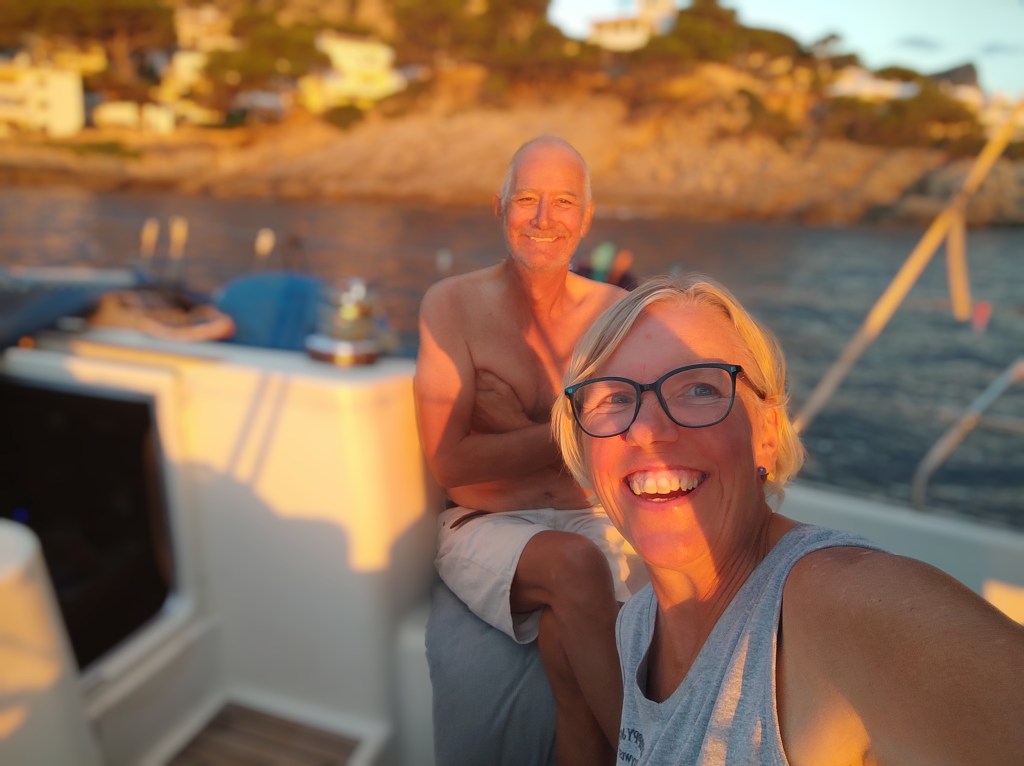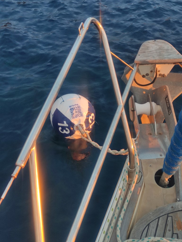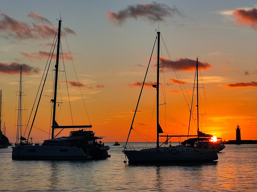 We rose before dawn with a yawn – first job of the day, check the weather forecast…..it was a go for the crossing back to Spain! and more than that, it was reasonable to go all the way back to Cartagena. When looking at these things we always have to consider the days ahead and we knew if we took the shorter route back to the Costa Blanca we could potentially be held up for quite some time with adverse wind and swell for the final journey back to Cartagena. So, as per usual we set out with a plan, and a double contingency – once we got out of the extremely sheltered San Antonio bay we would see how the sea state was (our main worry was the swell). If it was too bad to leave the islands we would head to Formentera. If It was too bad for the direction of Cartagena we would take the shorter route and if all was good we would aim to get back to our old berth in one long sail. First light saw us dropping the key to the pontoon gate back in the letterbox, leaving a little note for our boat twin neighbour Alex and unplugging the electric supply. Then it was a case of slipping the lines (untying the ropes and pulling them back on board) whilst Skipper Nigel reversed us out of our space and onwards into the bay. We could immediately tell the conditions were much, much better than the previous day and felt cautiously optimistic for the day ahead.