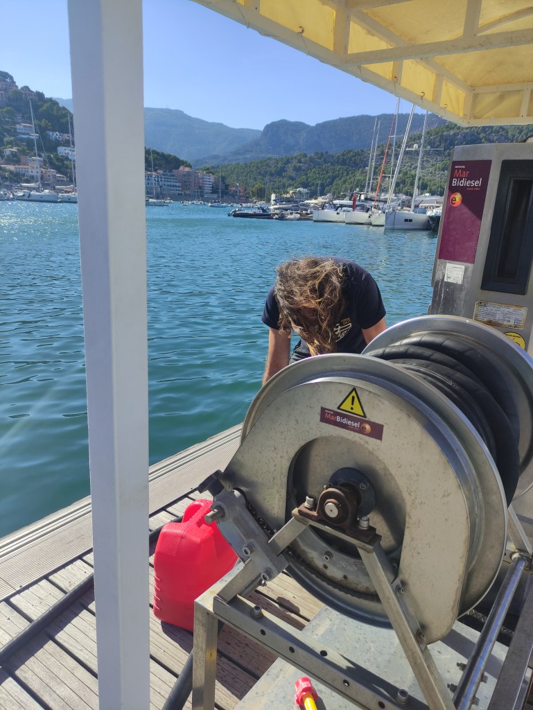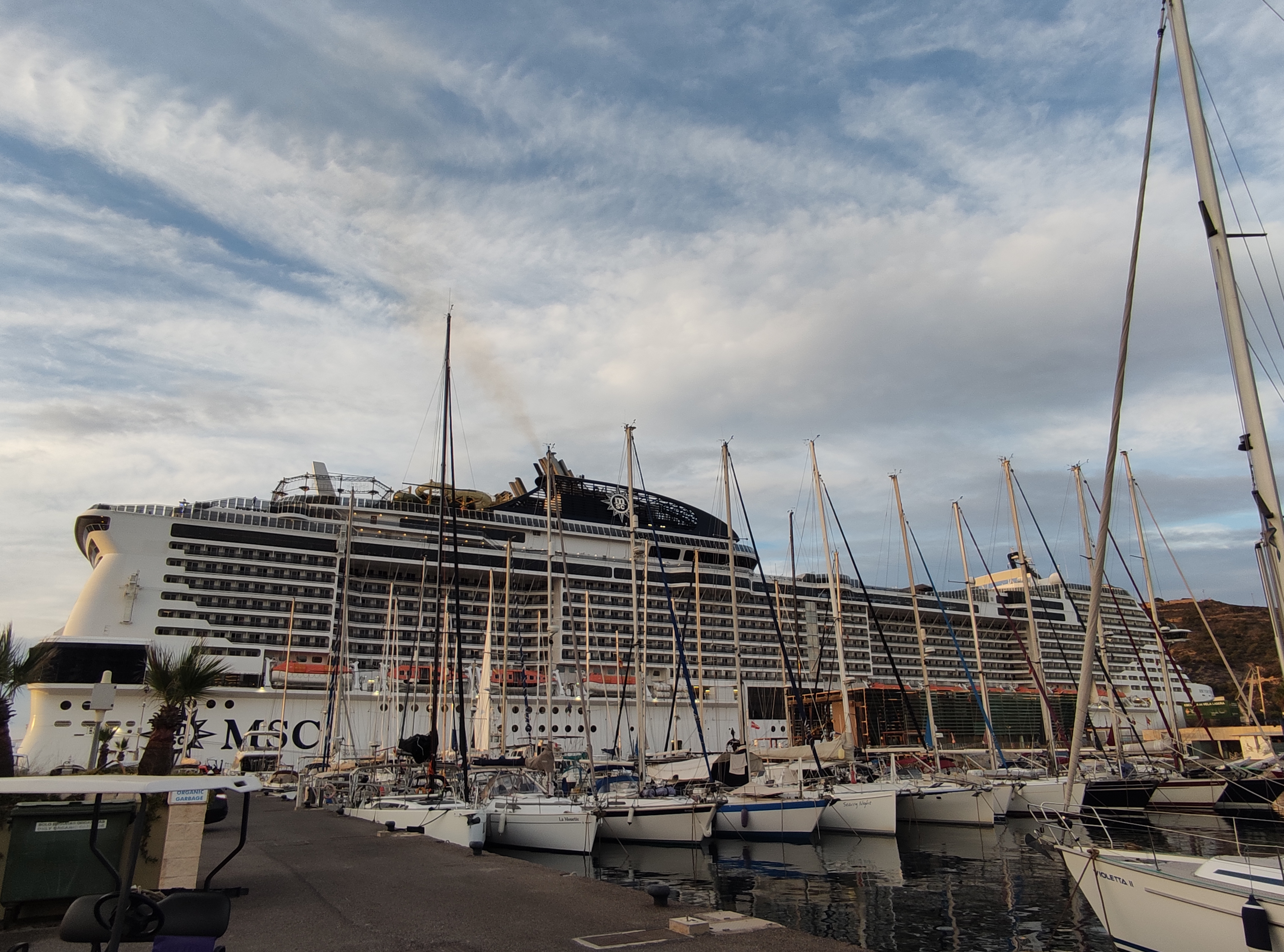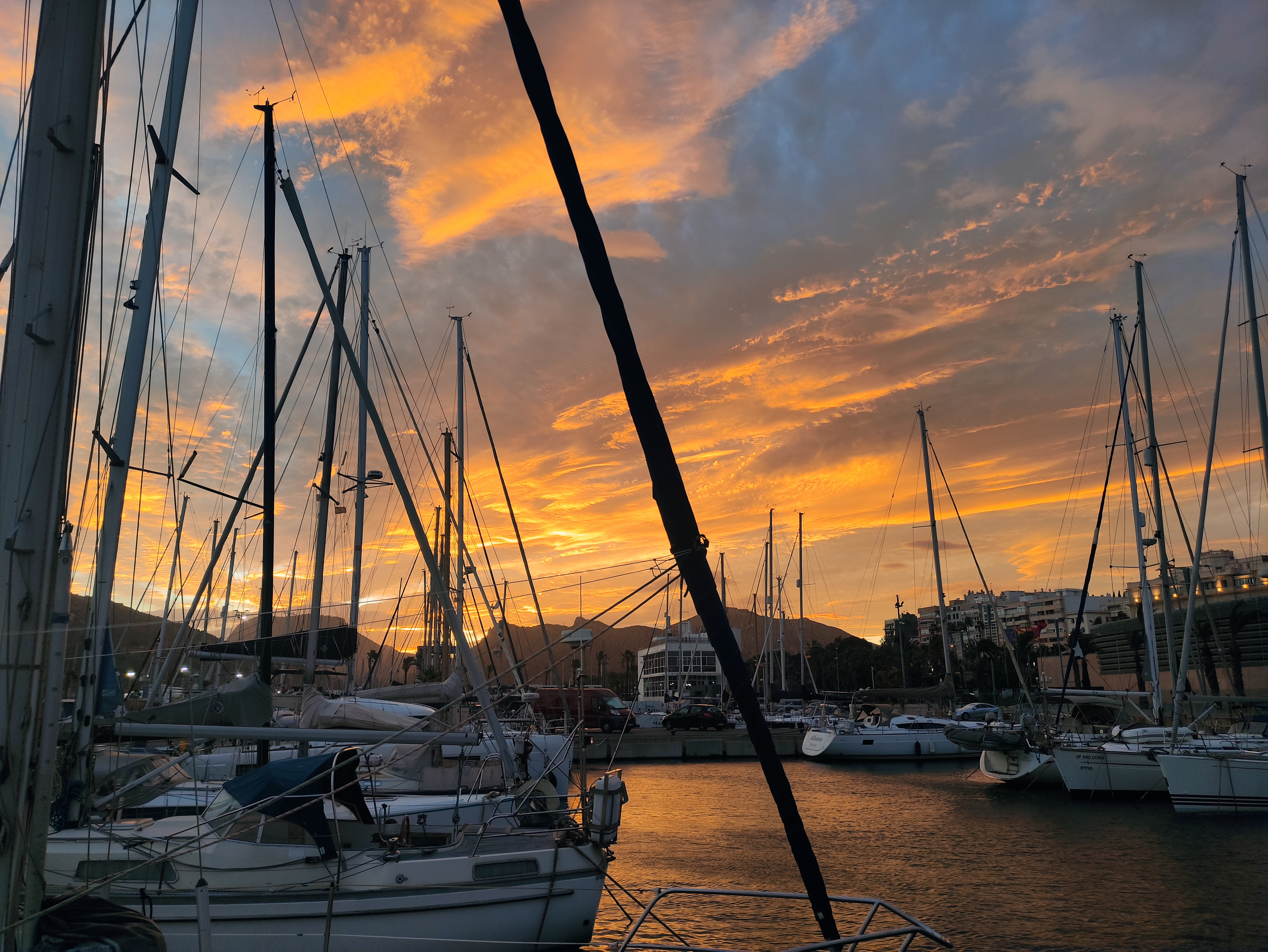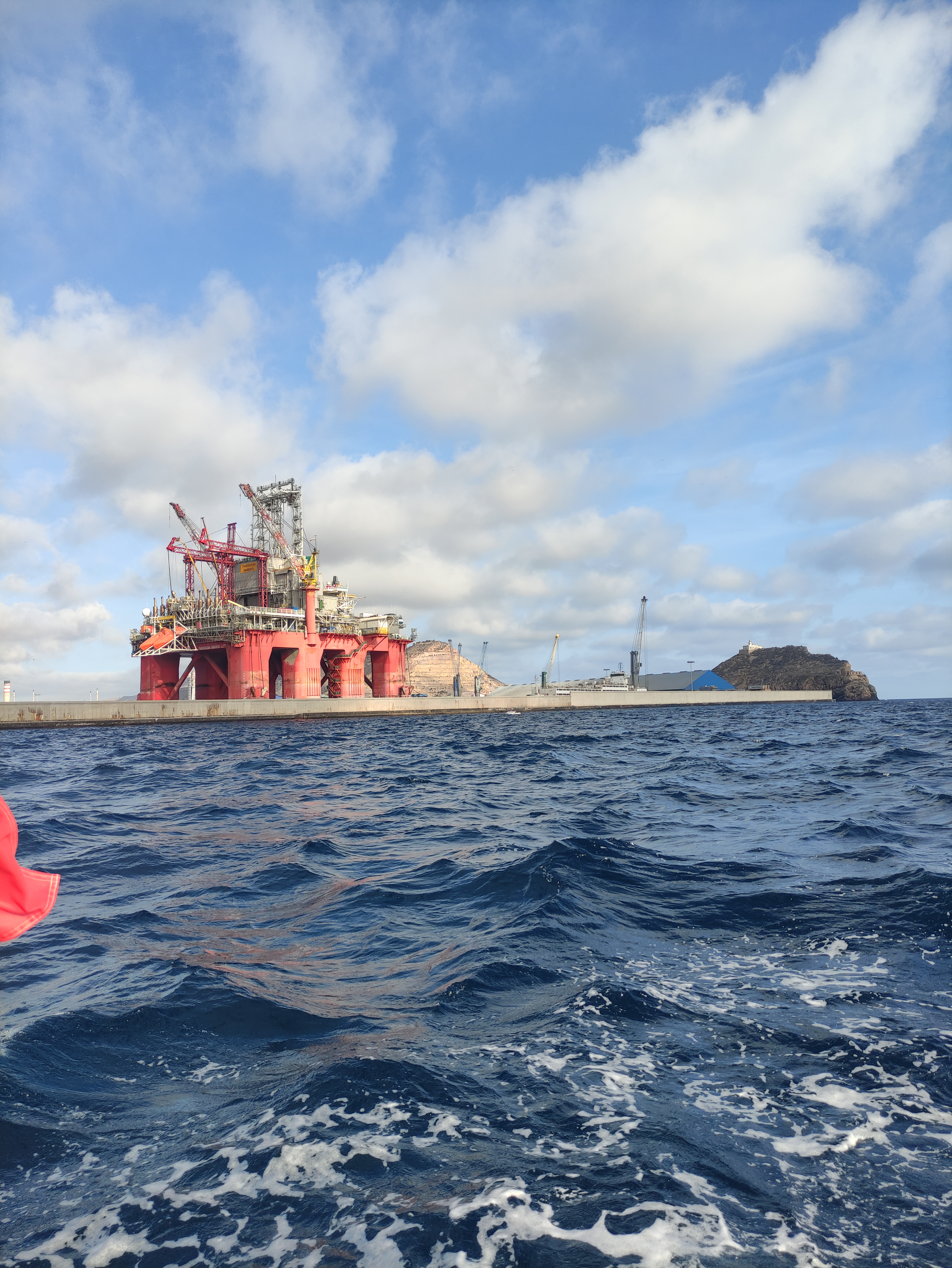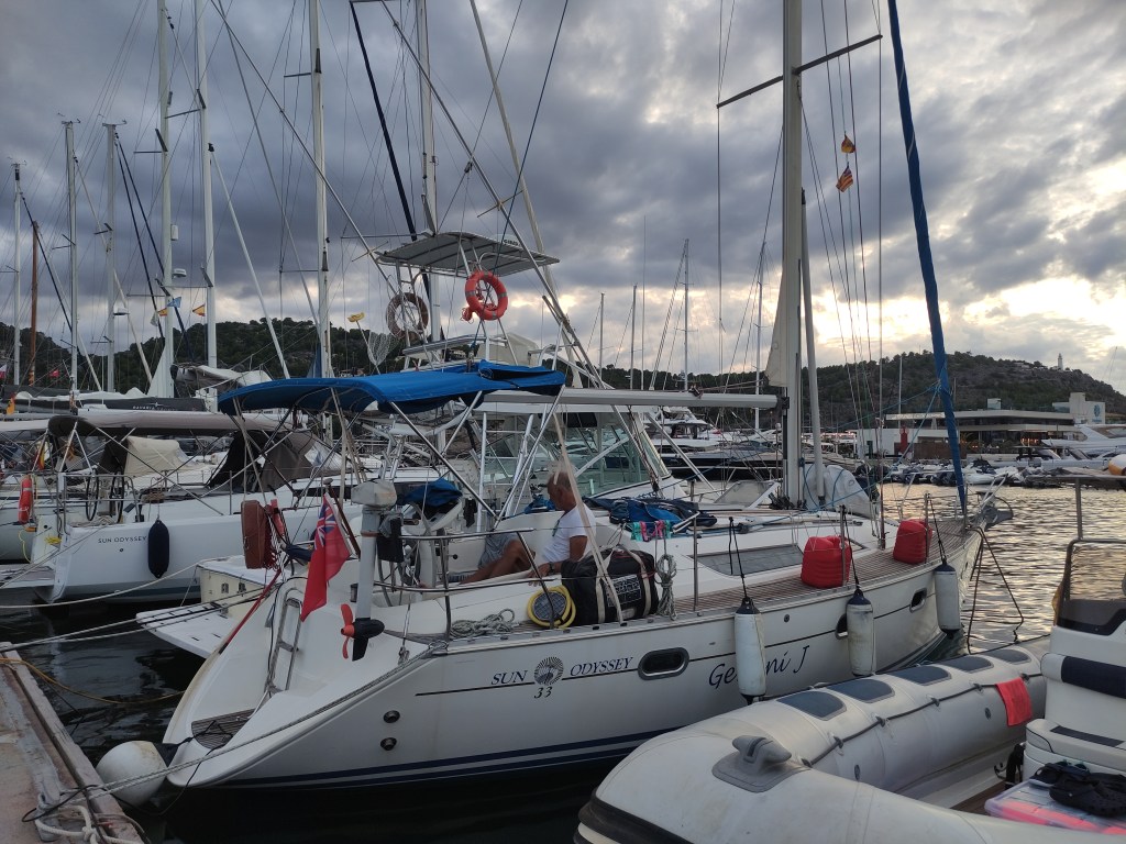 We continued on and eventually the islas hormigas and cabo de palos came into view – we knew we were on the home stretch. As we rounded the headland we even managed to put the sails out – happy days. We were still making very slow progress until about 10 nautical miles from Cartagena when we suddenly picked up speed !! We were absolutely flying along so whatever we had round our propeller, keel or rudder had obviously freed itself and away we went. We came round the corner to the port of Escombreras, past an oil rig and into port. It was a tricky entry as it was quite choppy and we still weren’t 100% confident that everything would be good in reverse but all’s well that ends well and Skipper Nigel and Gemini J came back on berth perfectly.