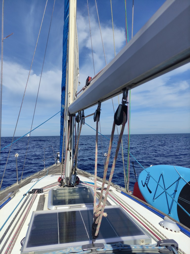 Unlike our voyage out to the islands, when we set off thinking we would do a day sail and changed our minds due to fantastic conditions, this time we knew we were most likely going to do an overnighter. This meant we were a bit more vigilant at taking turns on the helm and forced ourselves to rest more during the day too. We had also been better organised getting music set up and having cold pizza to snack on. It was an extremely clear day and before we had lost sight of Ibiza we could see mainland Spain – such a bonus. We also had internet connection right up to 20 nautical miles (4 hours) off the coast of Ibiza which surprised us after losing it so early when we left the coast of Spain on our way a few weeks earlier.