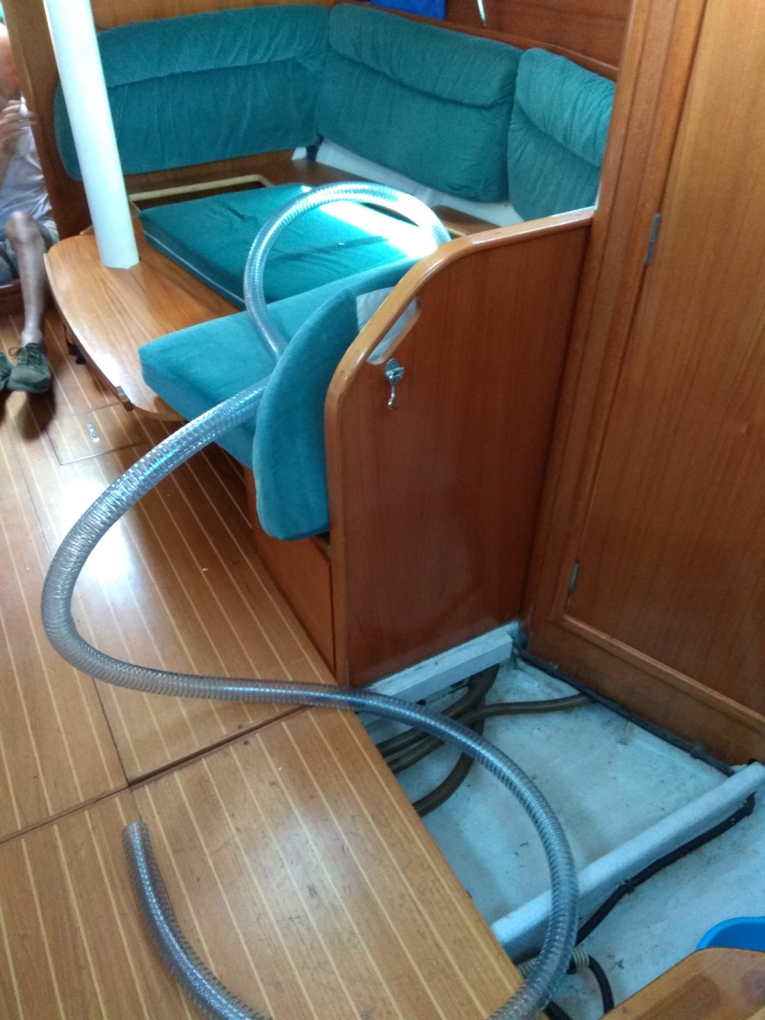 Just as we were getting ready to leave for the holiday earlier in the week we found a leak, getting progressively worse. The culprit was the grey water pump, that’s the pump which takes the waste water out of the boat. It was something that needed to be fixed and as usual, never a simple story. We asked the boatyard for a quote to fix (extortionate) then we decided to tackle the job ourselves, with the invaluable advice of our lovely boat neighbours. We ordered a pump, we waited for it to arrive and then the fun began! Taking the boat apart, the pipework goes more or less half the length of the boat and as you can imagine as it basically goes under the floor it is a pretty horrific task. It involved us crawling all over the floor and squeezing our arms into gaps and places that you wouldn’t normally need to go. Removing the hoses at the beginning of the job wasn’t too bad, however, reinstalling the new hoses, (after we’d been to the chandlery to buy a great length of snakelike pipe in between times) was a bit of a nightmare. This was definitely a team effort, with guidance from our neighbours too and with lots and lots of huffing and puffing we managed it. In addition the connection to the tank which holds the grey water was found to be corroded so another bit of ingenious invention on Skipper’s part fixed that problem and the new pump was installed.