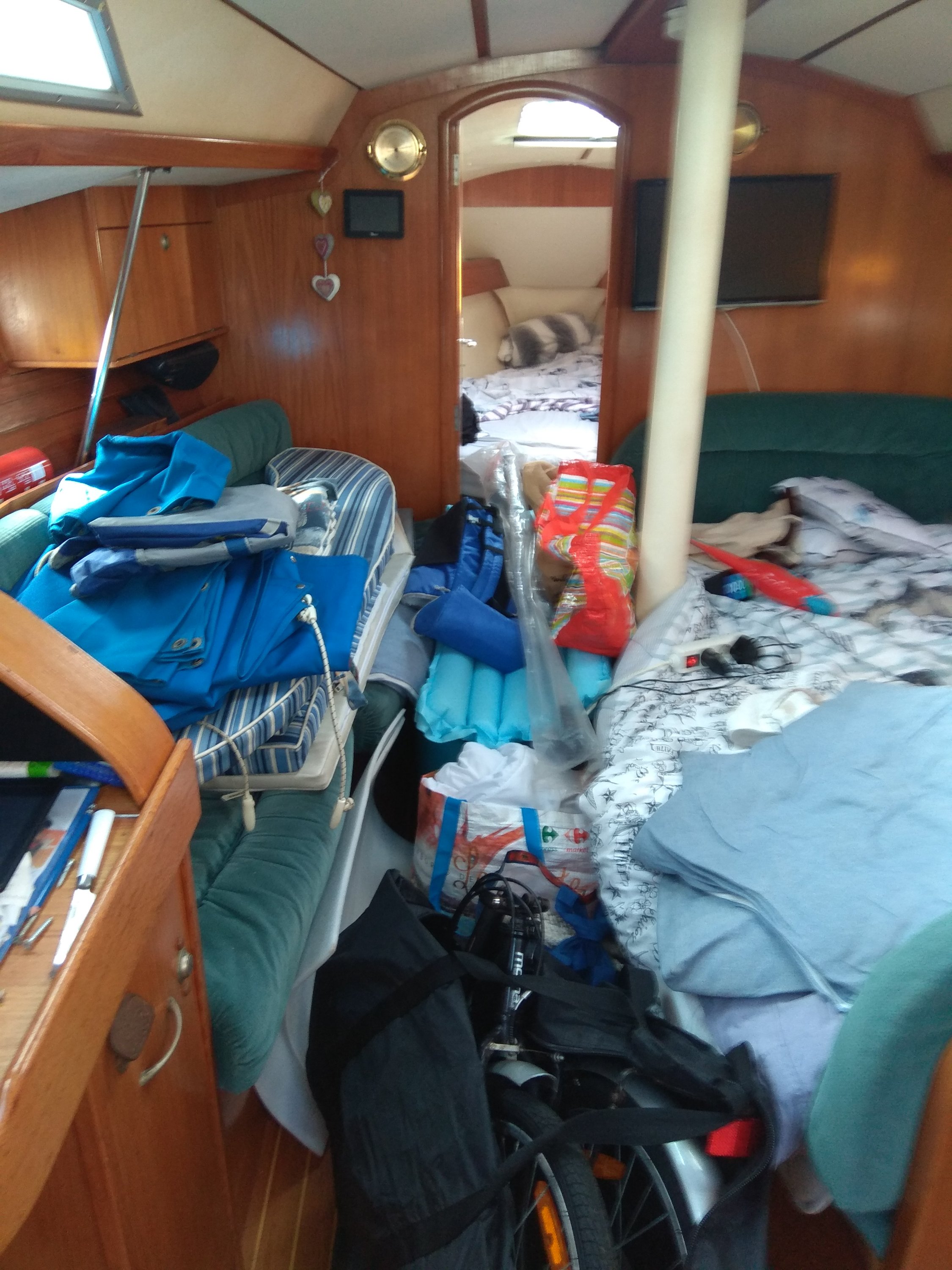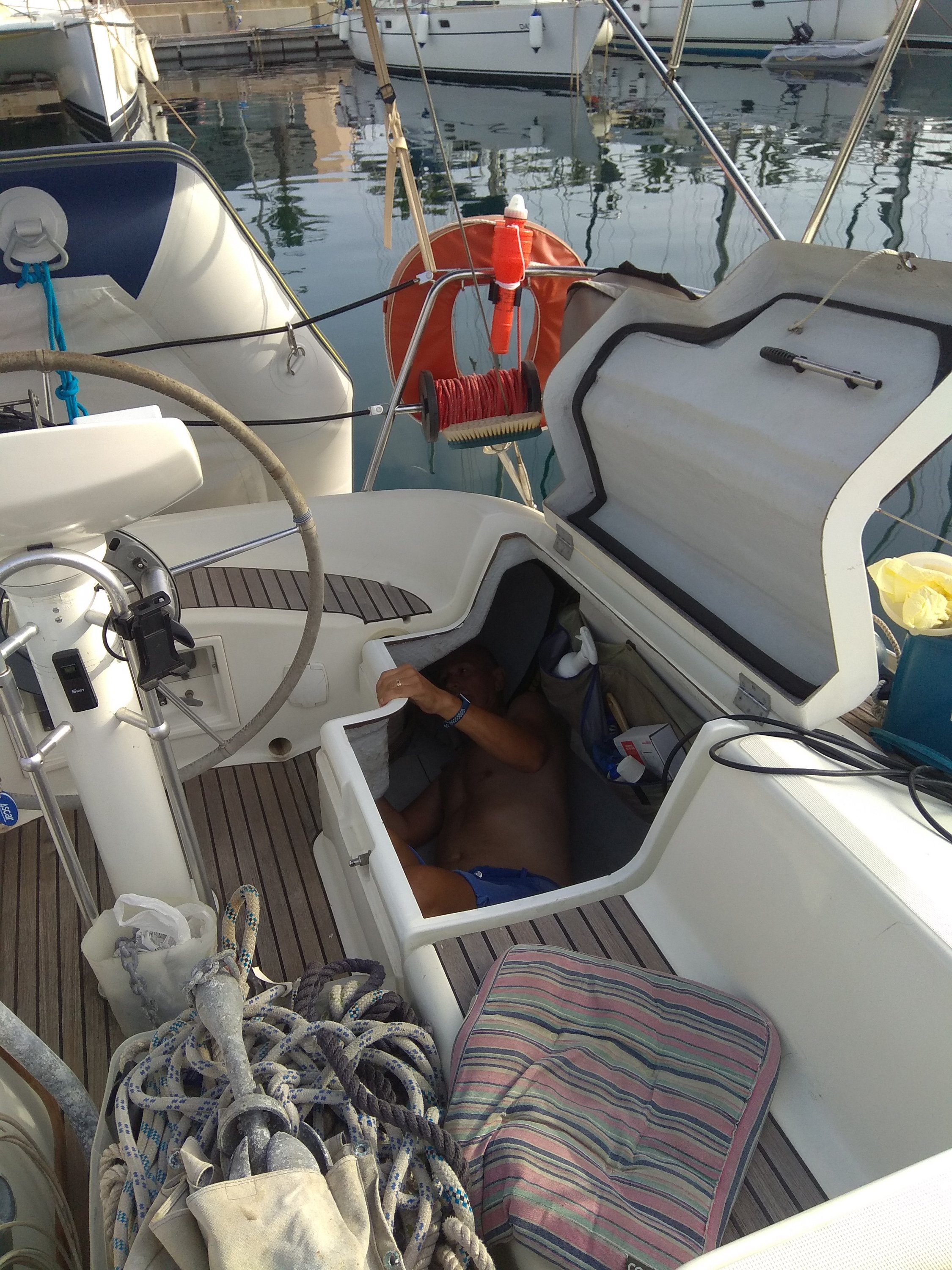 Friday morning we were up early and emptied the portside locker which is where we believed the fluxgate to be…..this was no small job and it was really, really hot too. That is the locker where we keep all our fuel, spare ropes/lines, cleaning products, table, entry hatch, spare anchor, spare tiller …….the list goes on, as you can imagine it’s quite a big locker! The next step was for Skipper Nigel to get inside and remove the fluxgate…..