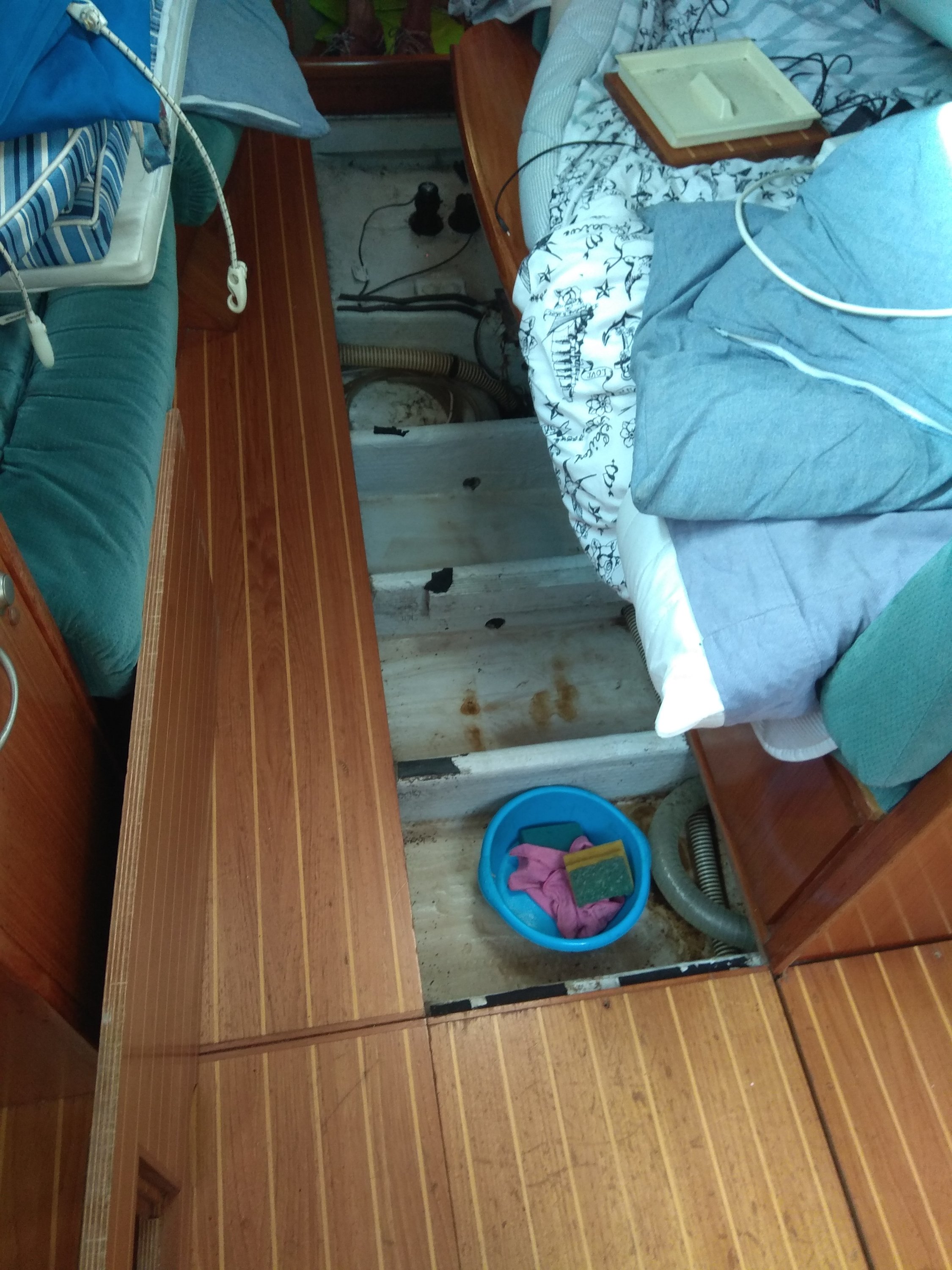 We knew it should be somewhere near-ish to the centre line of the boat, and located away from other electronics etc. So we had to start looking elsewhere, we emptied the locker on the starboard side, not there. We went down below, we took up all the floorboards, nowhere to be found there. We emptied the aft cabin, and that took some doing, not there either.
