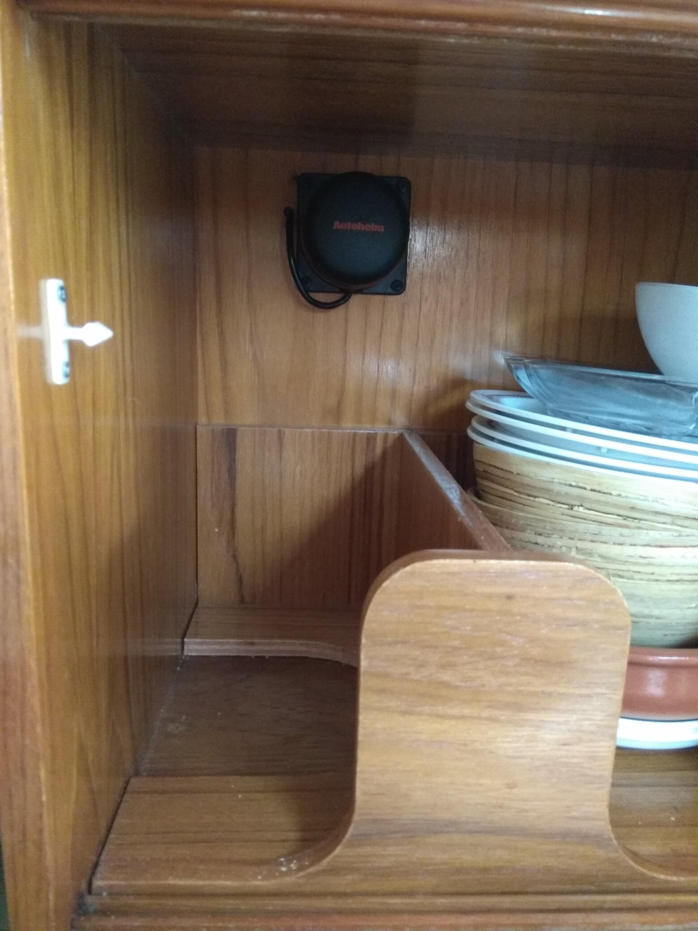 Finally – Skipper Nigel searched the coffee/tea, cups and plates cupboard and there it was ! Plain as day, not easy to see without crouching down but still, the easiest place of all the places we had searched!!!!!