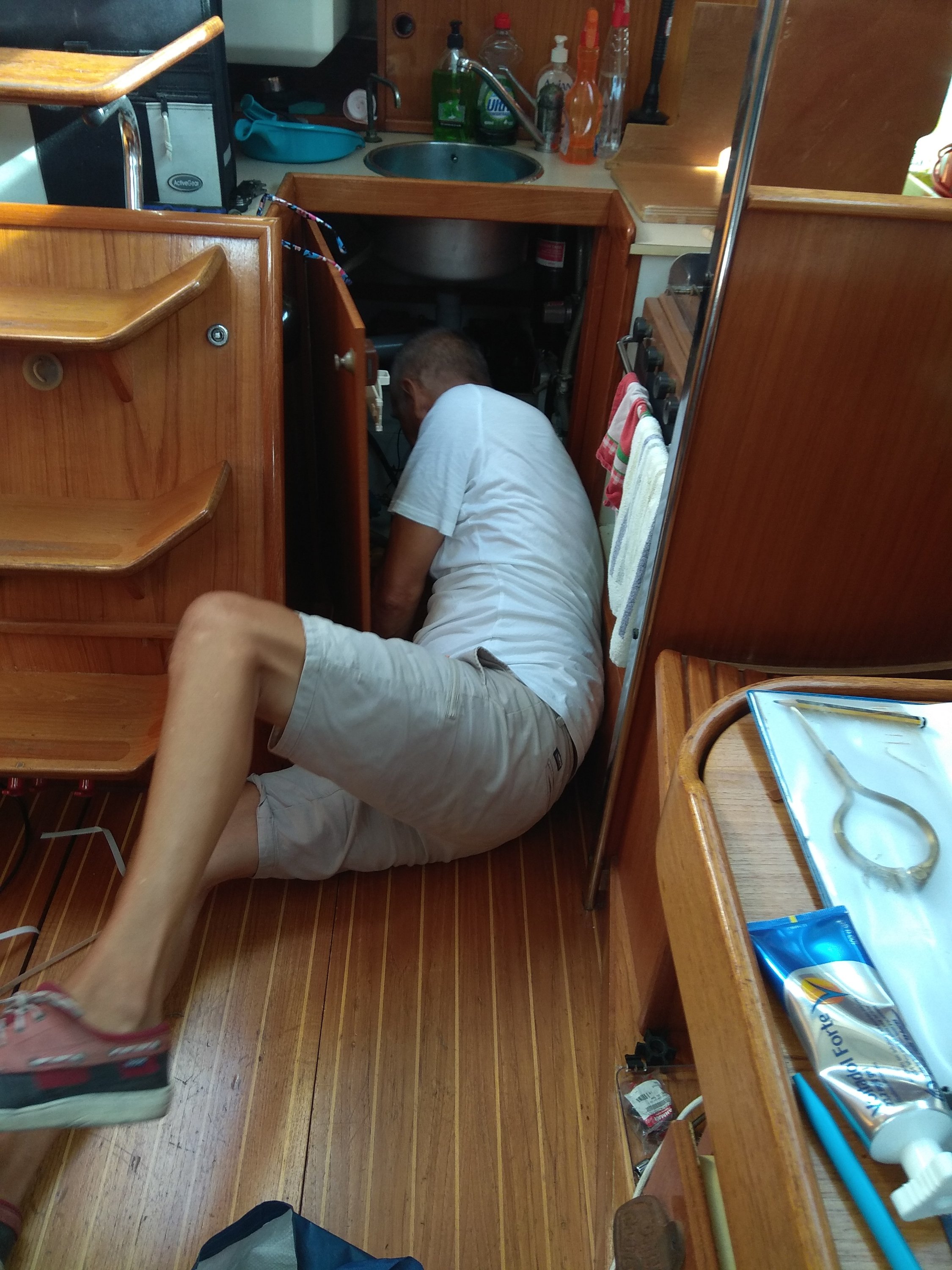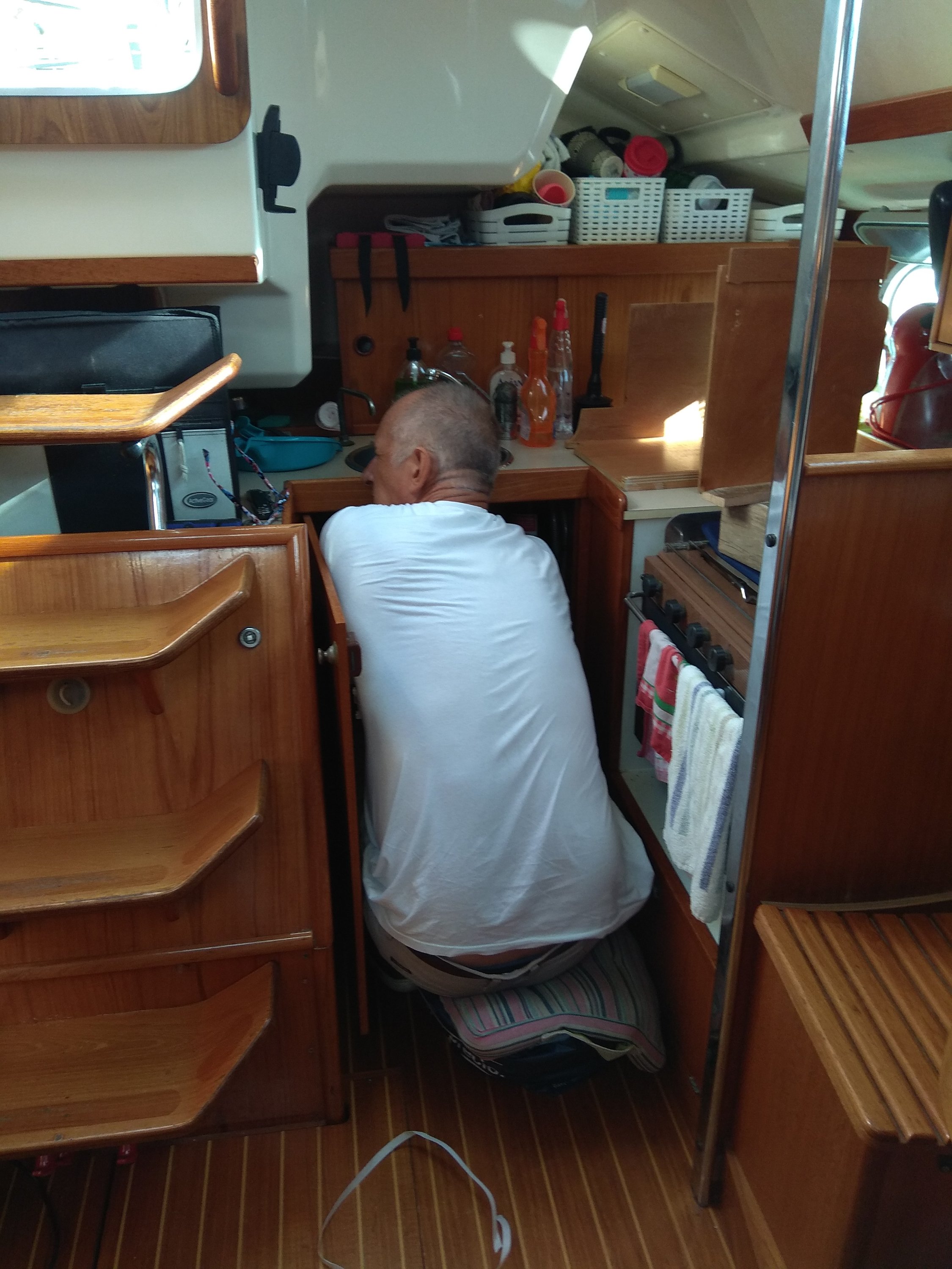 A check of the batteries revealed the need to get right under the sink – funnily enough below the new fluxgate compass…..to replace one of the 3 batteries. We had two replaced when we were in Majorca a couple of years ago now, but one was over 3 years old and a check of it (after it had been removed!) revealed it was a good decision to make the change.