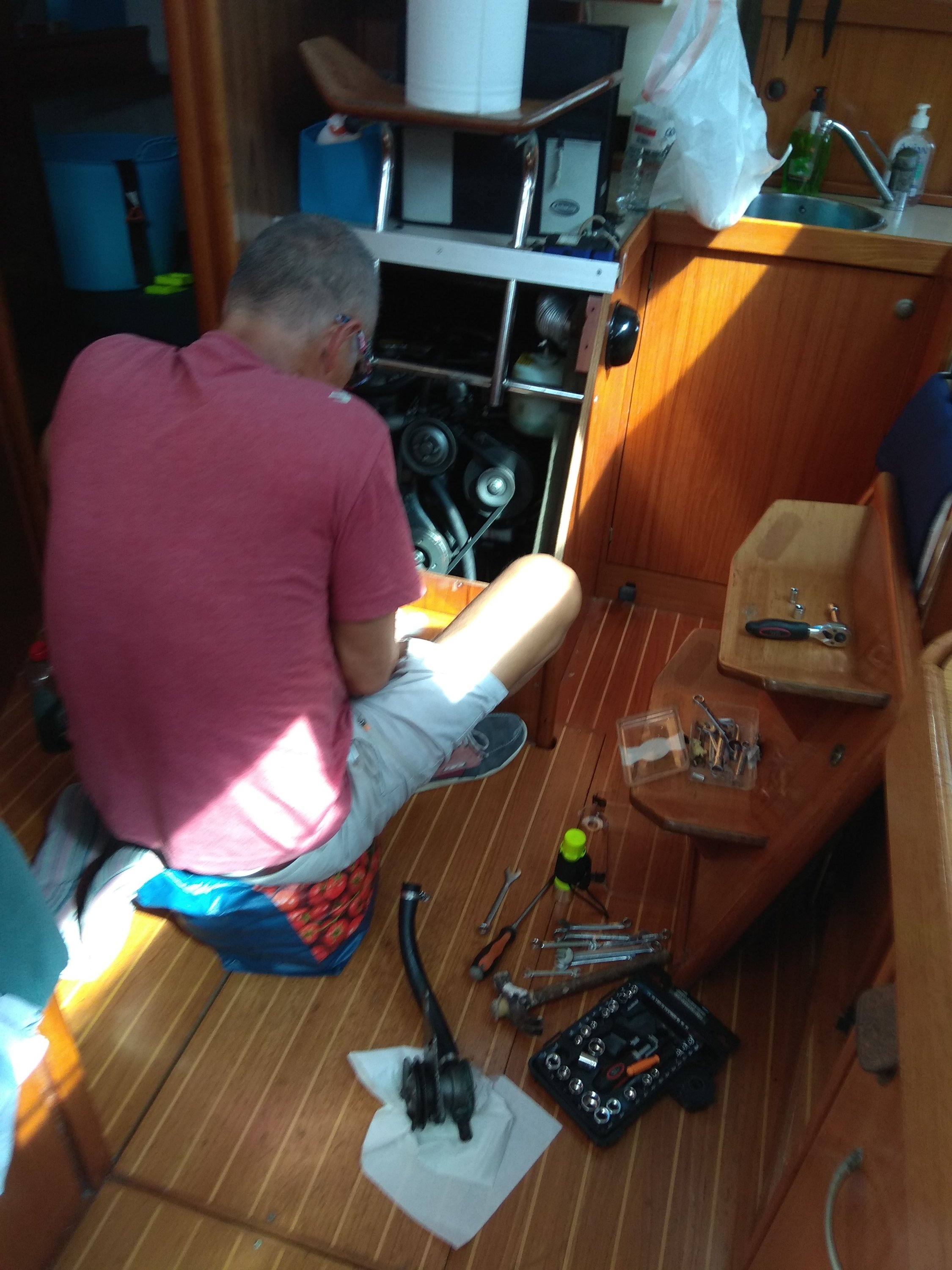After fluxgate last weekend (page down for the previous update) Skipper Nigel still found some small spaces to work in this weekend, replacing a battery, the fuel filter and the impeller! All of which involved contorting himself into various positions to get access to do the jobs.