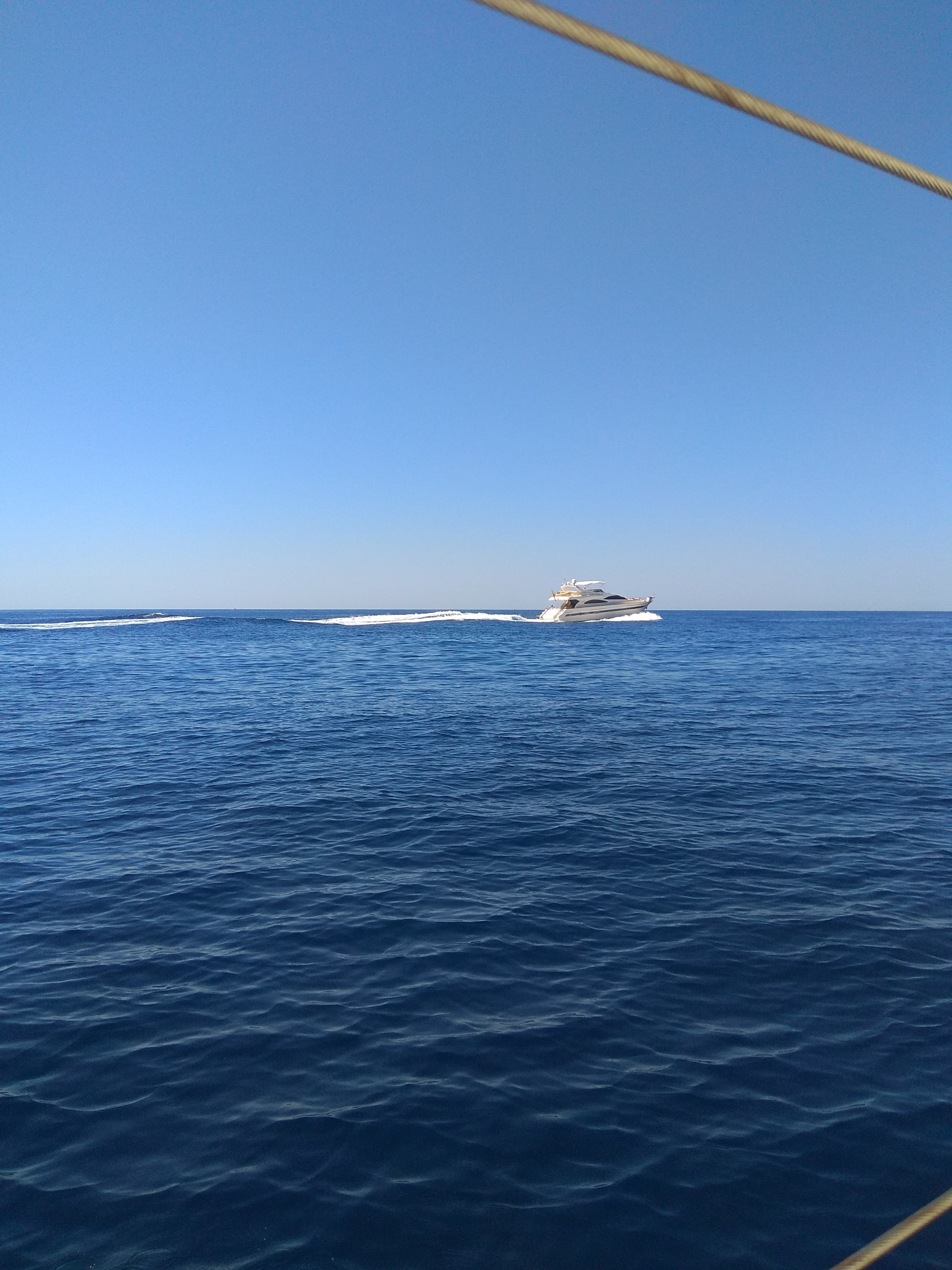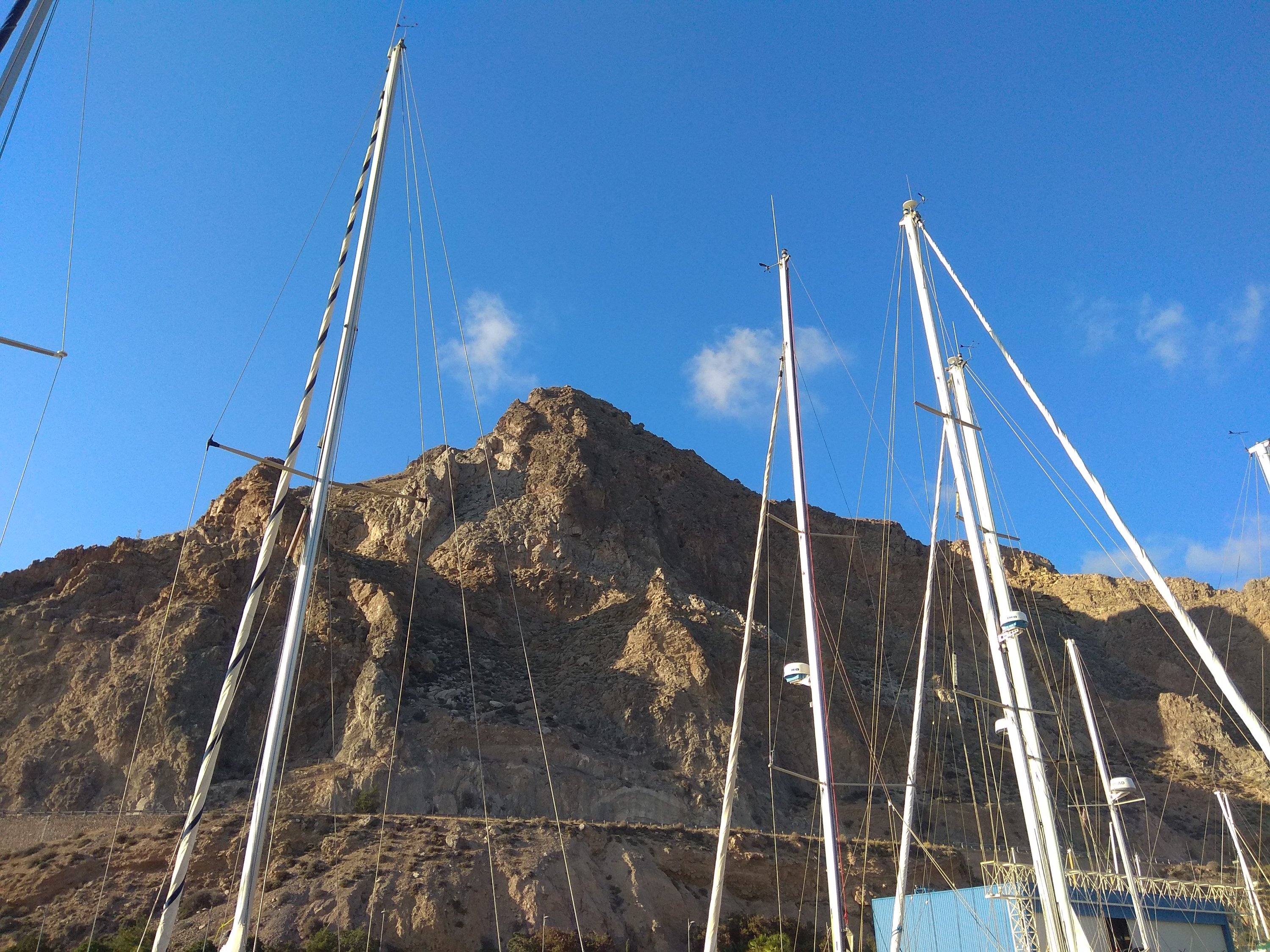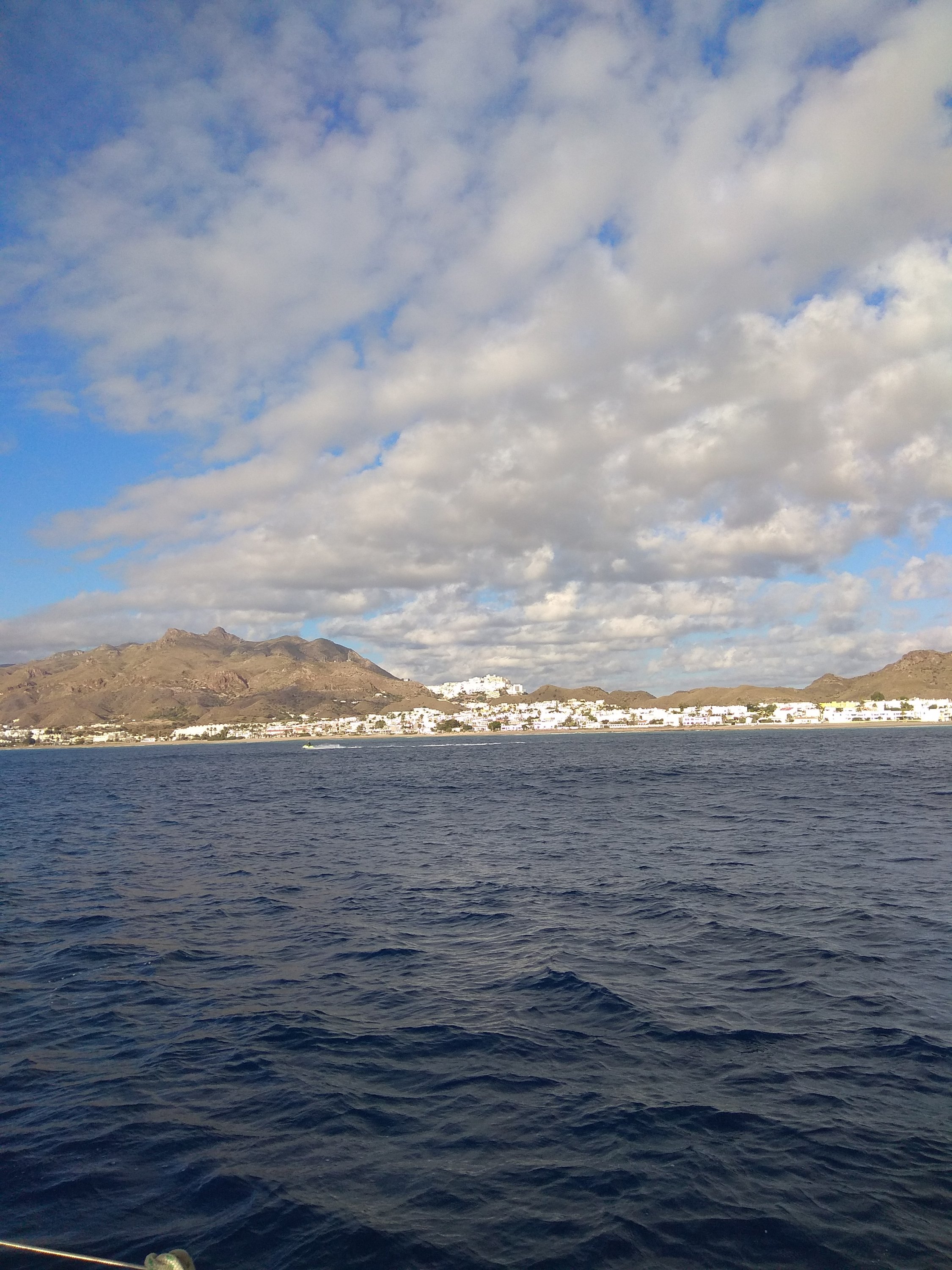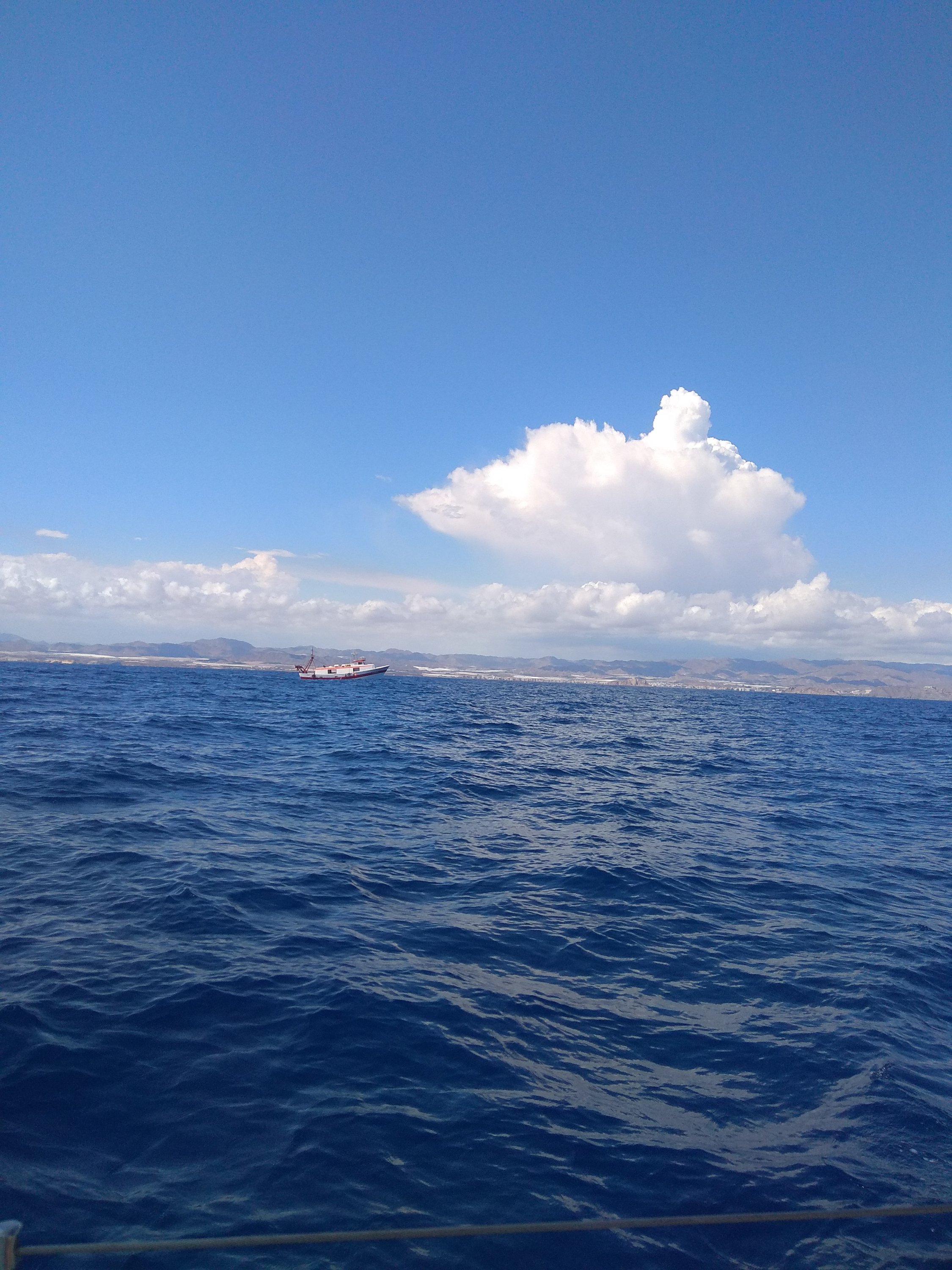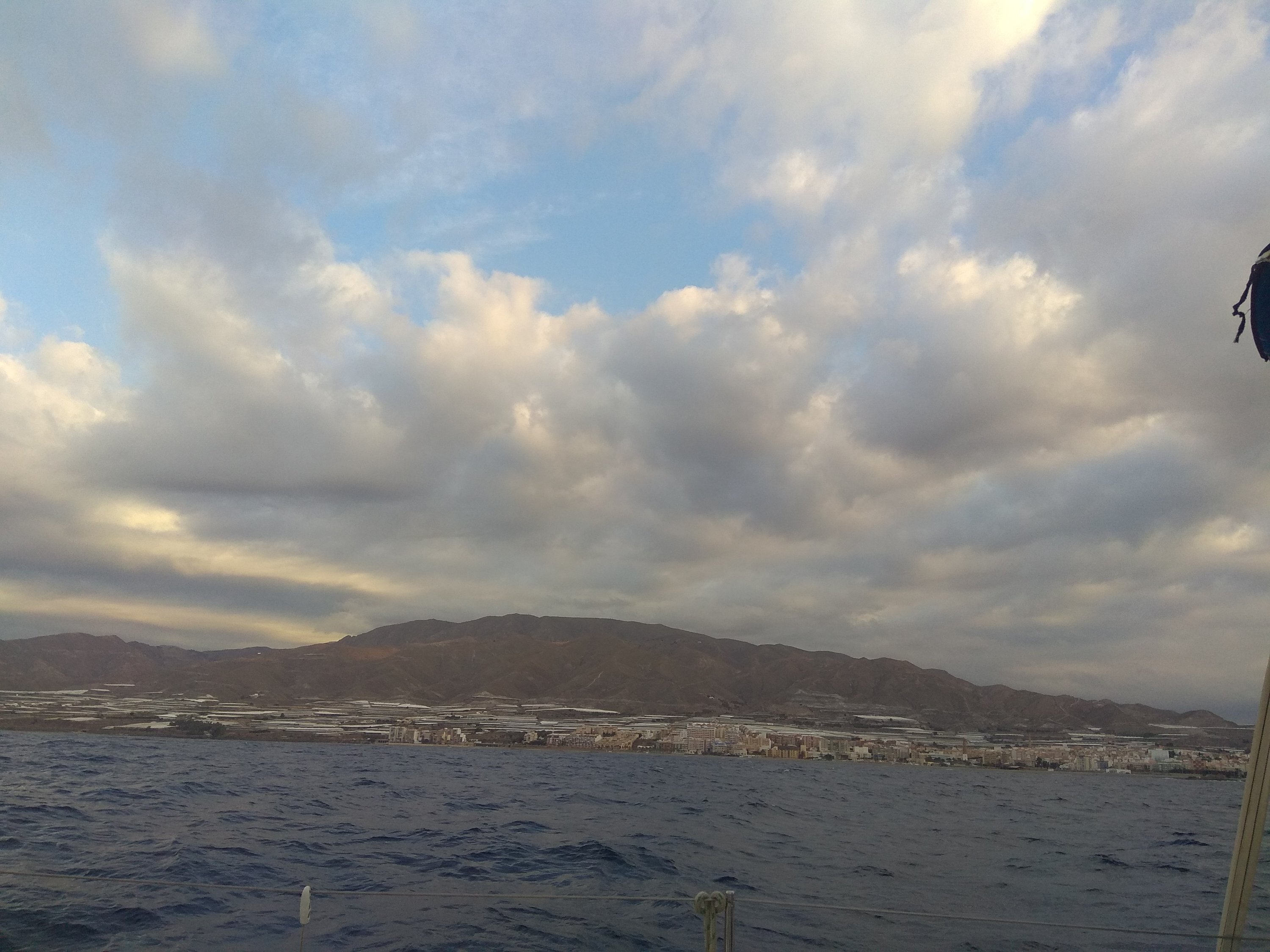 We were very excited about an hour into the journey when we set sail proper, putting out the mainsail and genoa sail and switching off the engine. 20 minutes later the wind dropped and we were back to using our mainsail and motor. It was quite comfortable and we headed at 240 degrees all day to get to Garrucha. The only real excitement was a frightening moment when a large speedboat approached us from behind really, really fast. I was freaking out thinking they hadn’t seen us but it was quite the opposite as the Guardia Civil slowed down and pulled alongside us (at a distance) – they gave us quite a scan, looking at us through binoculars. We were expecting a call on the radio but they simply sped off again, quite an experience. Luckily it has happened to us once before and we expect it will happen again. The water is very, very quiet, we saw precious few sailboats and the odd trawler. We heard on the radio of a migrant boat with 42 people on board in difficulty (as usual, “keep a sharp lookout”) which is becoming increasingly regular to hear.