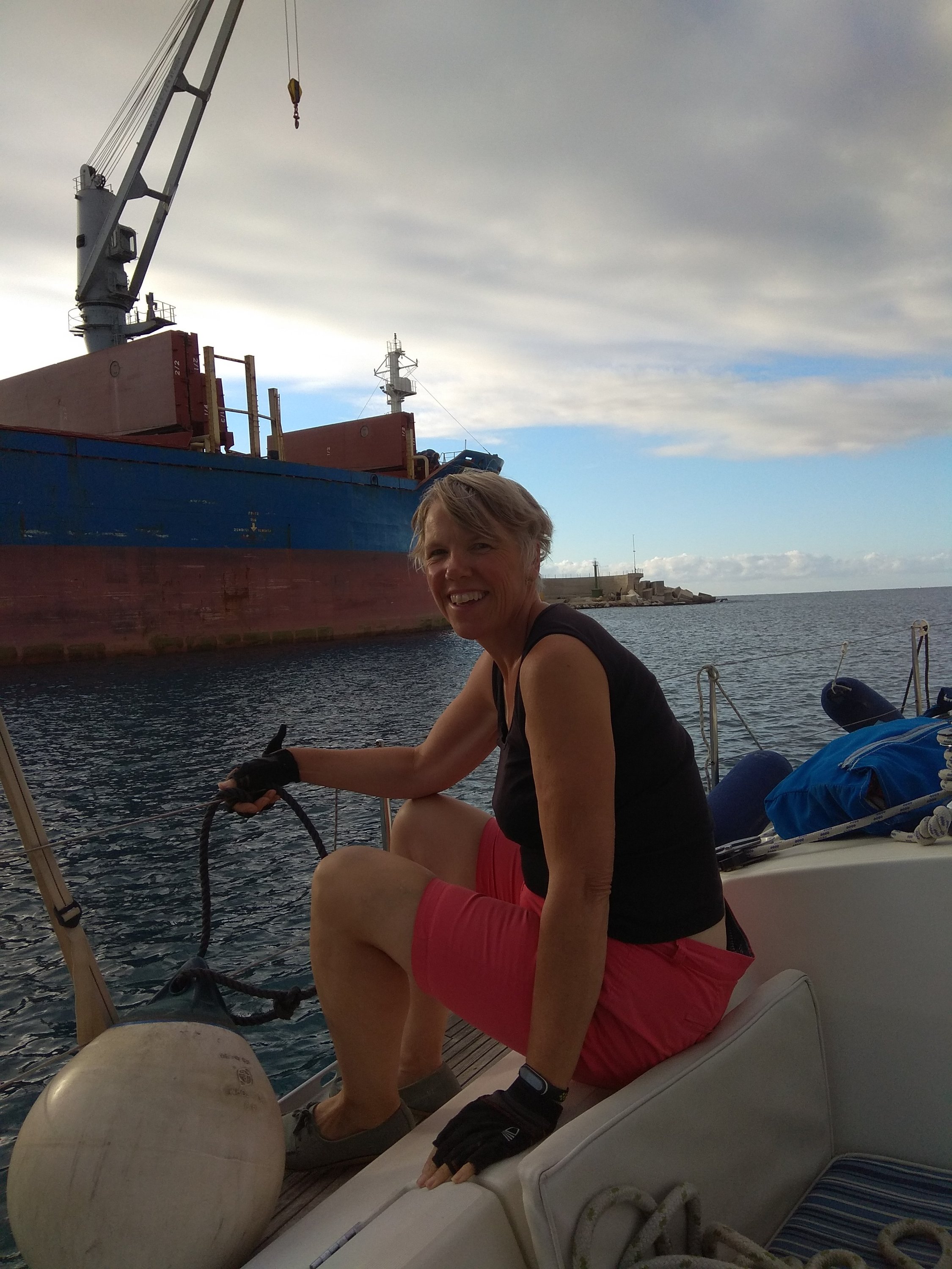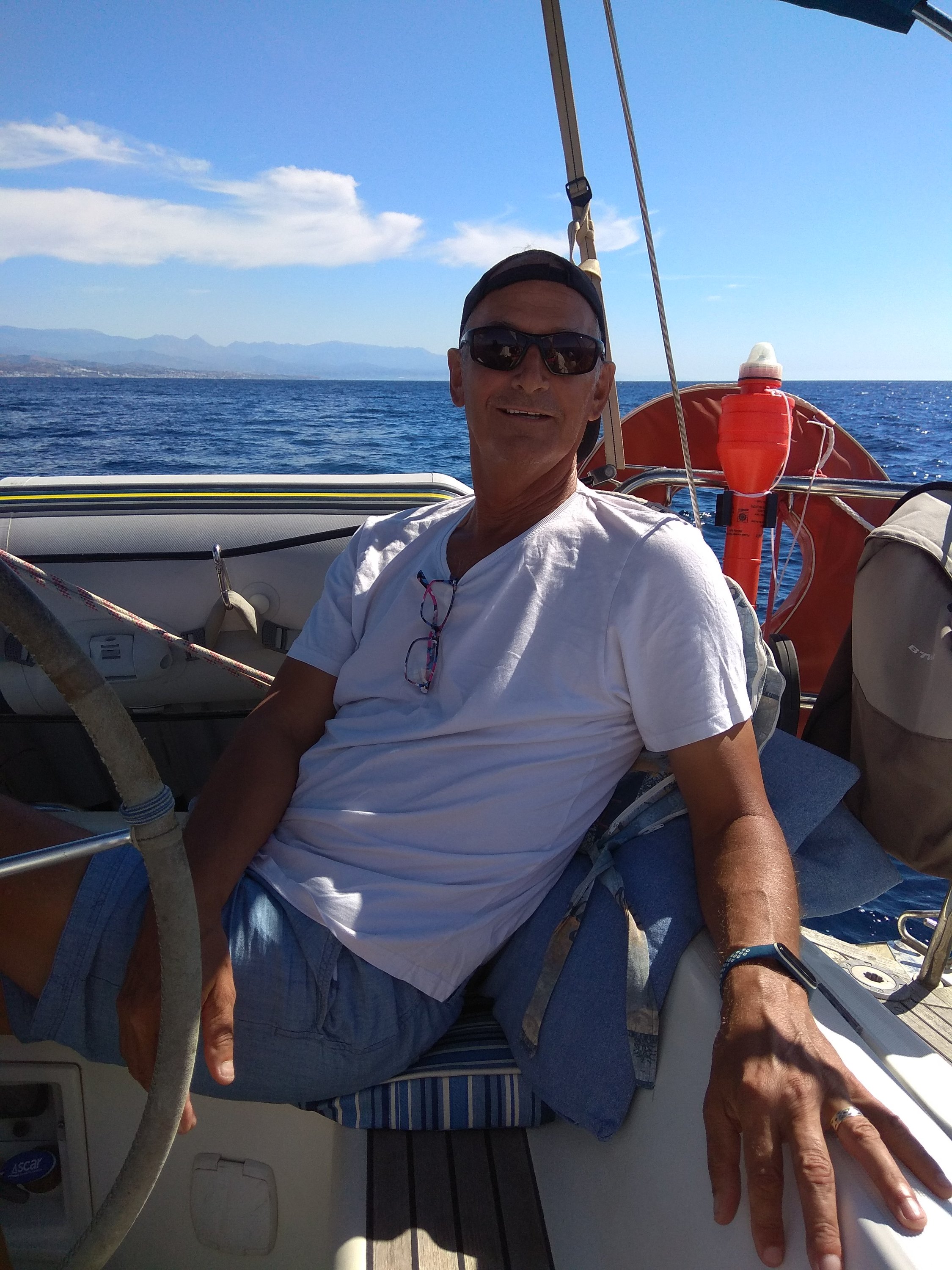 As we approached Marbella quite Suddenly the wind picked up, and very dramatically.  All of a sudden we had 20 plus knot winds, combined with the swell we were soon making more than 6 knots speed which is very fast for us.  Skipper Nigel then  had the unenviable task of getting us into the marina at Marbella.  Things were quite hairy on the approach to the marina, added to which it has one of the “shortest” entries, so very little time between rounding the breakwater and mooring alongside on the waiting quay.   I couldn’t make my usual casual preparations with the fenders, I couldn’t move down the boat until we were almost upon the quay as I was hanging on and I certainly had to hang on with the waves round the breakwater, we were bobbing around crazily. Extremely luckily for us we were being blown onto the quay, which meant my step onto the dockside was fairly easy.  We tied up and skipper Nigel breathed a sigh of relief.  However the fun wasn’t over because after I did the paperwork in the office we had to move the boat onto a proper berth for the night.   The wind was blowing 22 knots and it was quite a challenge getting off the waiting quay (this time we were working against the wind). I had to work quickly to get the lines/ropes in the right place and Skipper Nigel had to read the water/current and wind to make sure we ended up safely on the other side of the marina. He did a superb job and anyone watching might have been none the wiser to how difficult it all was. We were smiling 10 minutes later enjoying our drinks on deck safely behind the harbour wall which the waves were crashing over!