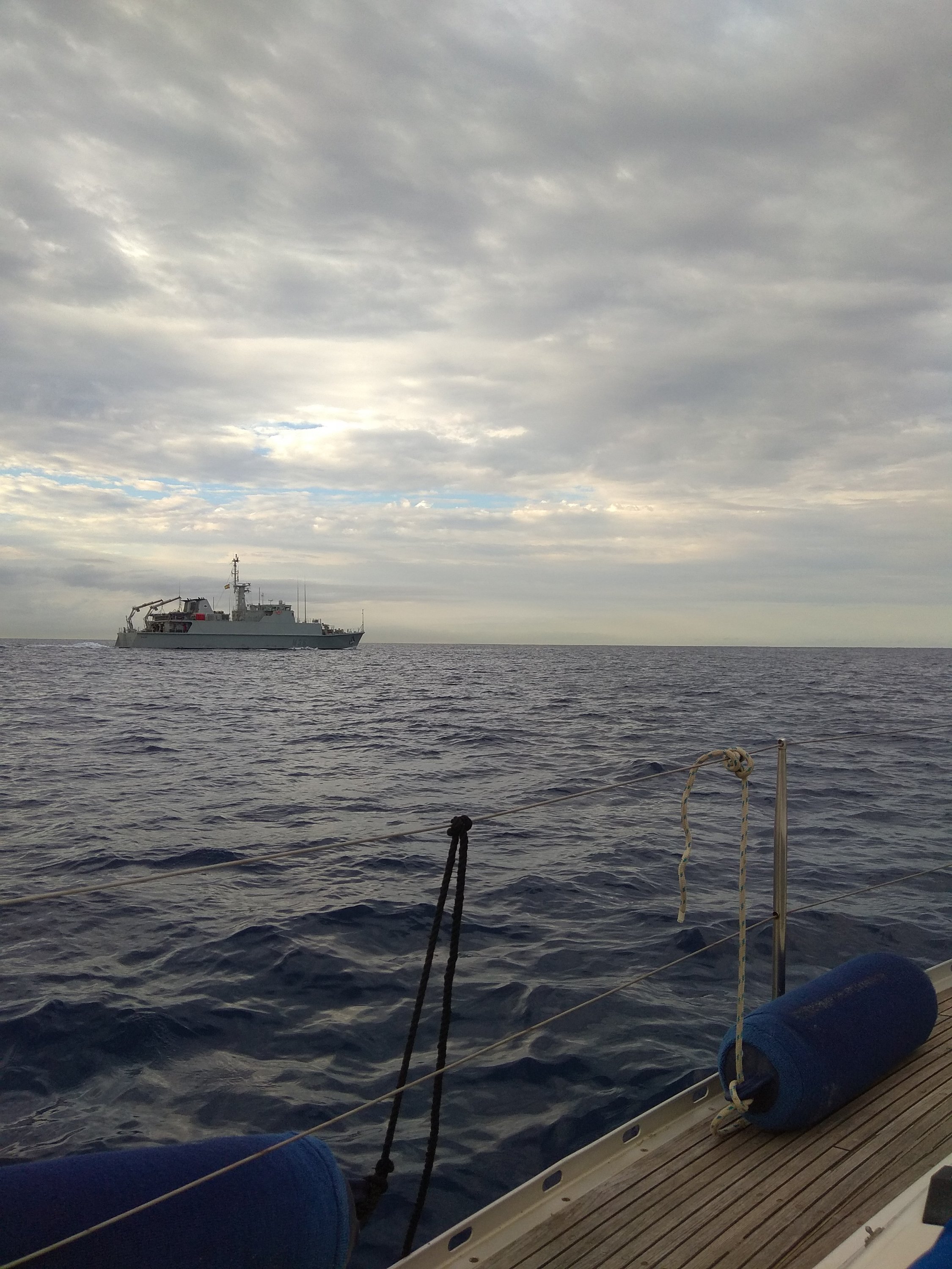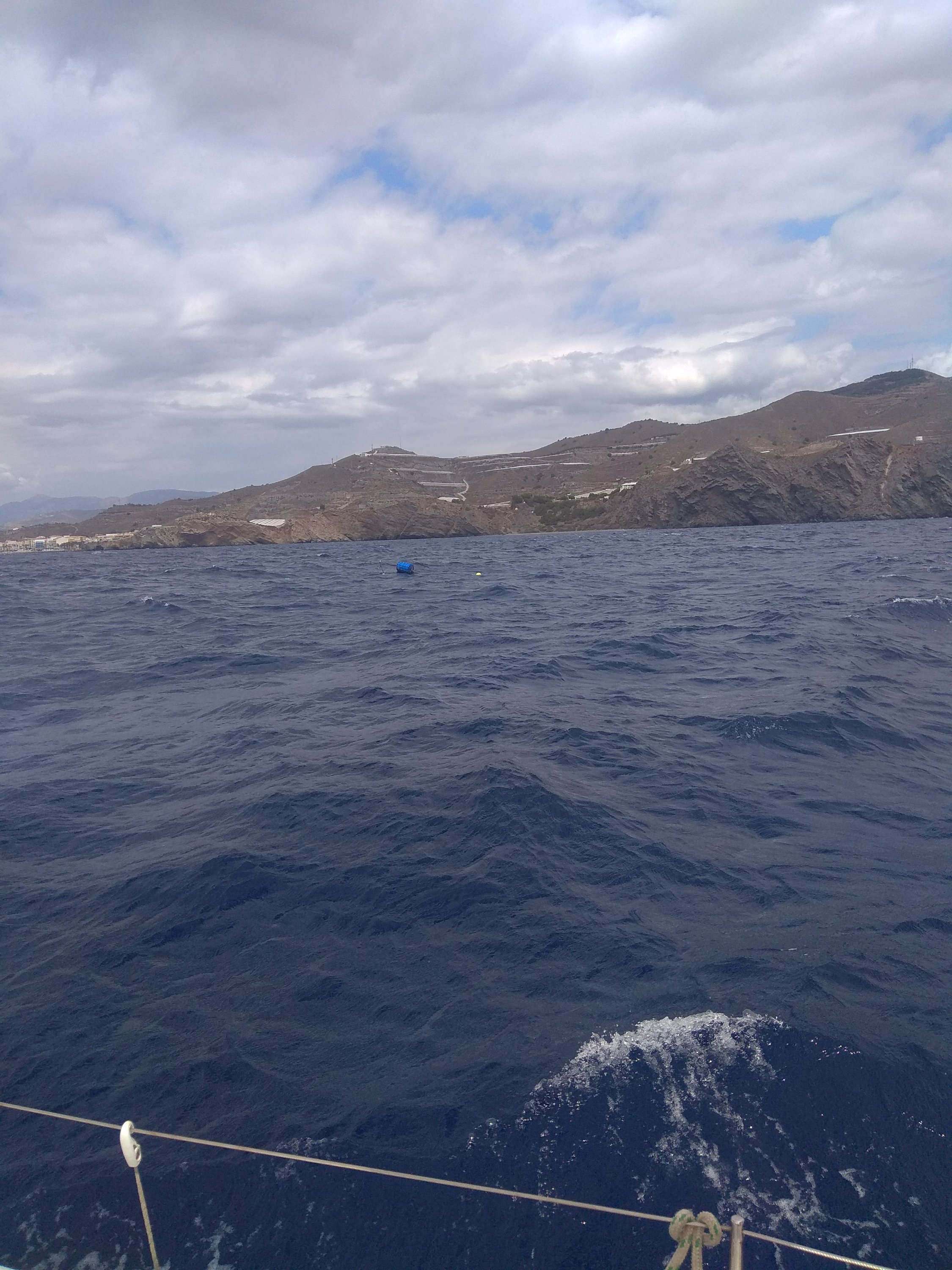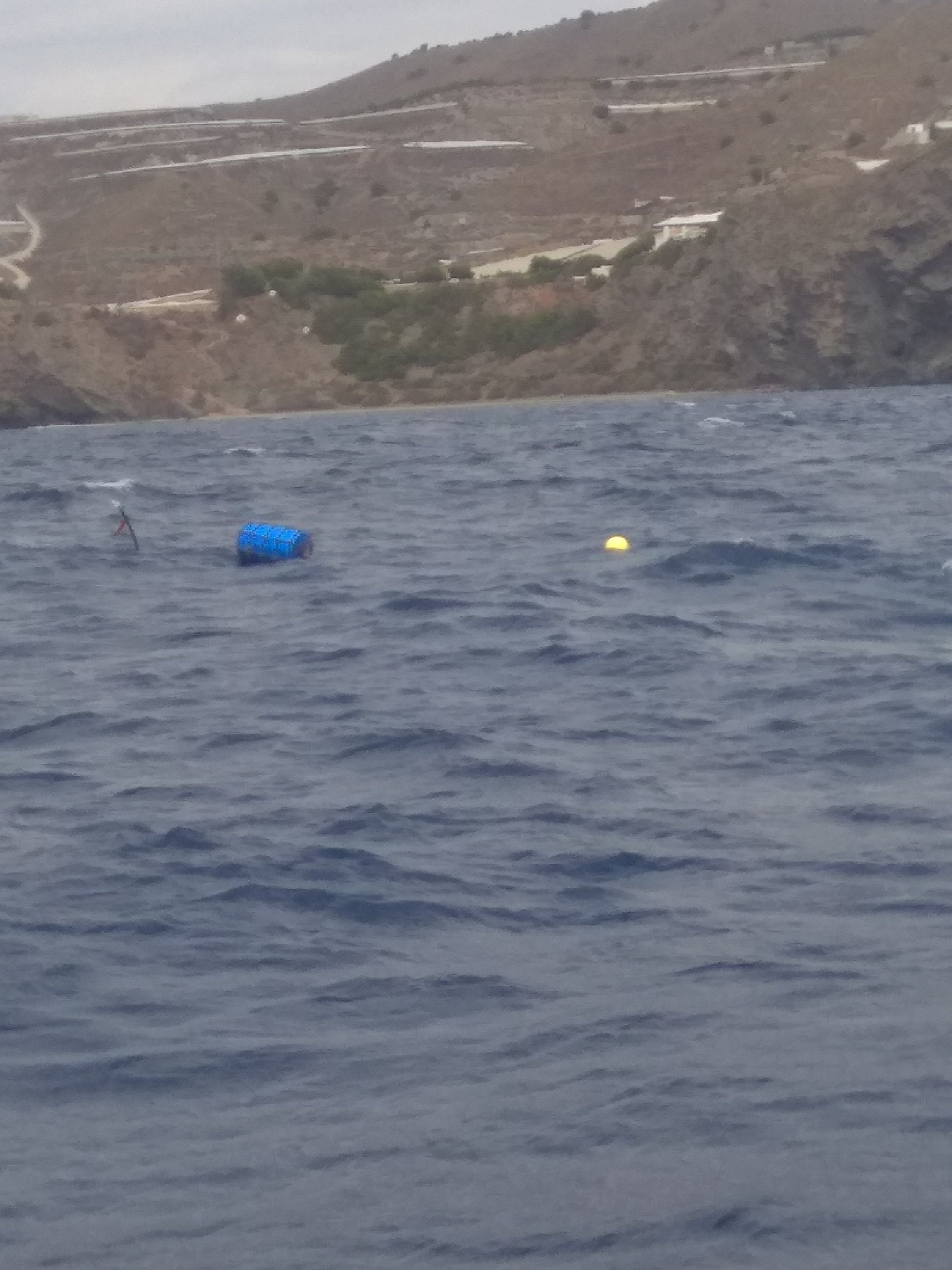 As we sailed past Motril we had seen a fishing boat, a little later we saw a suspicious blue container in the water – quite a difficult spot as it completely blended in. As we got closer we realised there were two, they did have smaller yellow buoys attached but were still very difficult to spot. We had to do a very swift tack to avoid them.