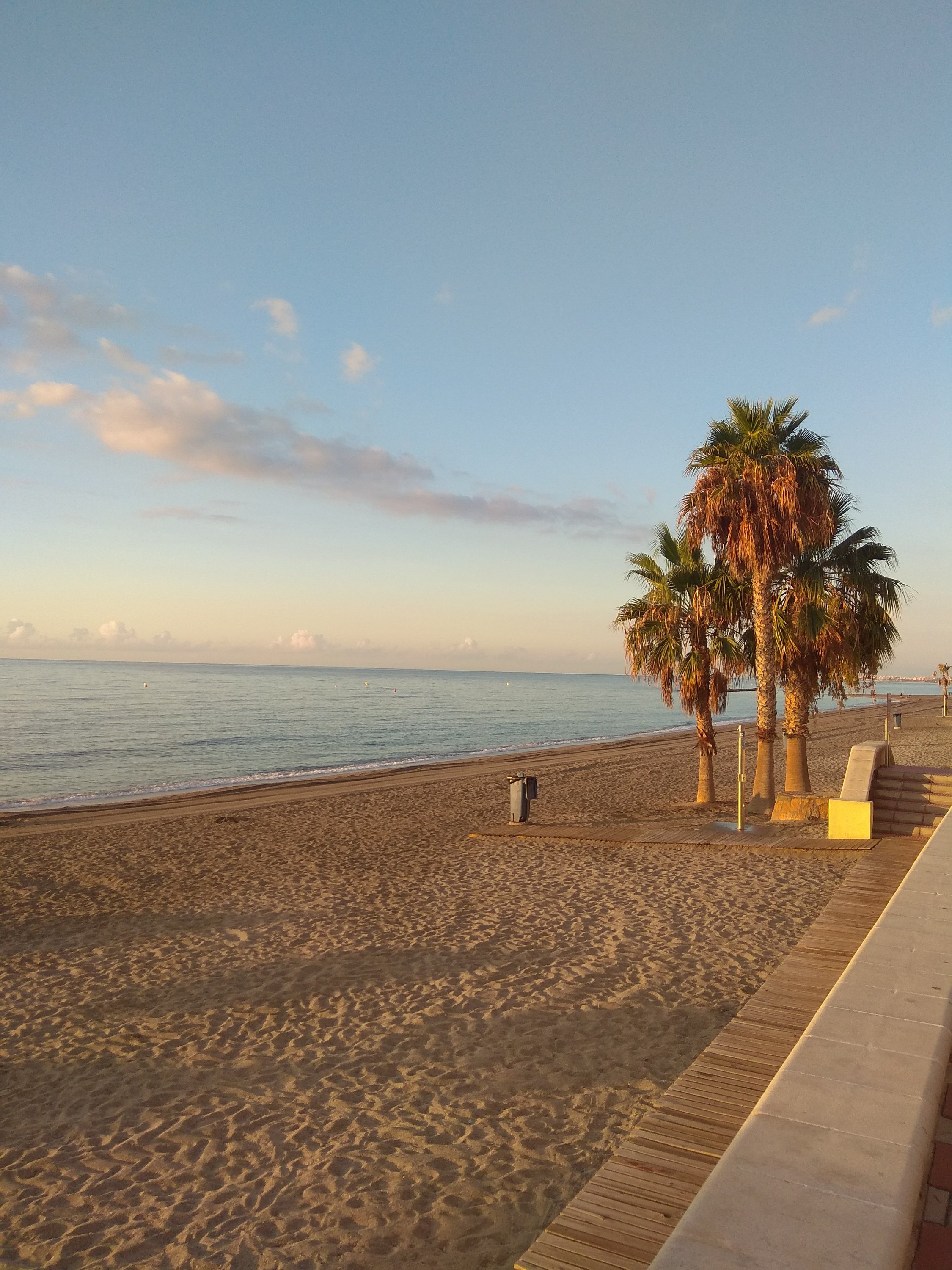 We are now on the Costa del Sol and it is still really warm here. The next morning I was up early again heading out for my walk.  I was out with the cleaning crews and sporty people once again.  There are two paseos (seaside walks) from this marina, the first one was closed for cleaning so I walked in the other direction and found lots of beach front hotels, restaurants and bars and barbecue restaurants on the beach too.  They seem to offer a speciality “fish on a stick” dish, perhaps we should try it sometime.   The sunrise as I came back was beautiful.