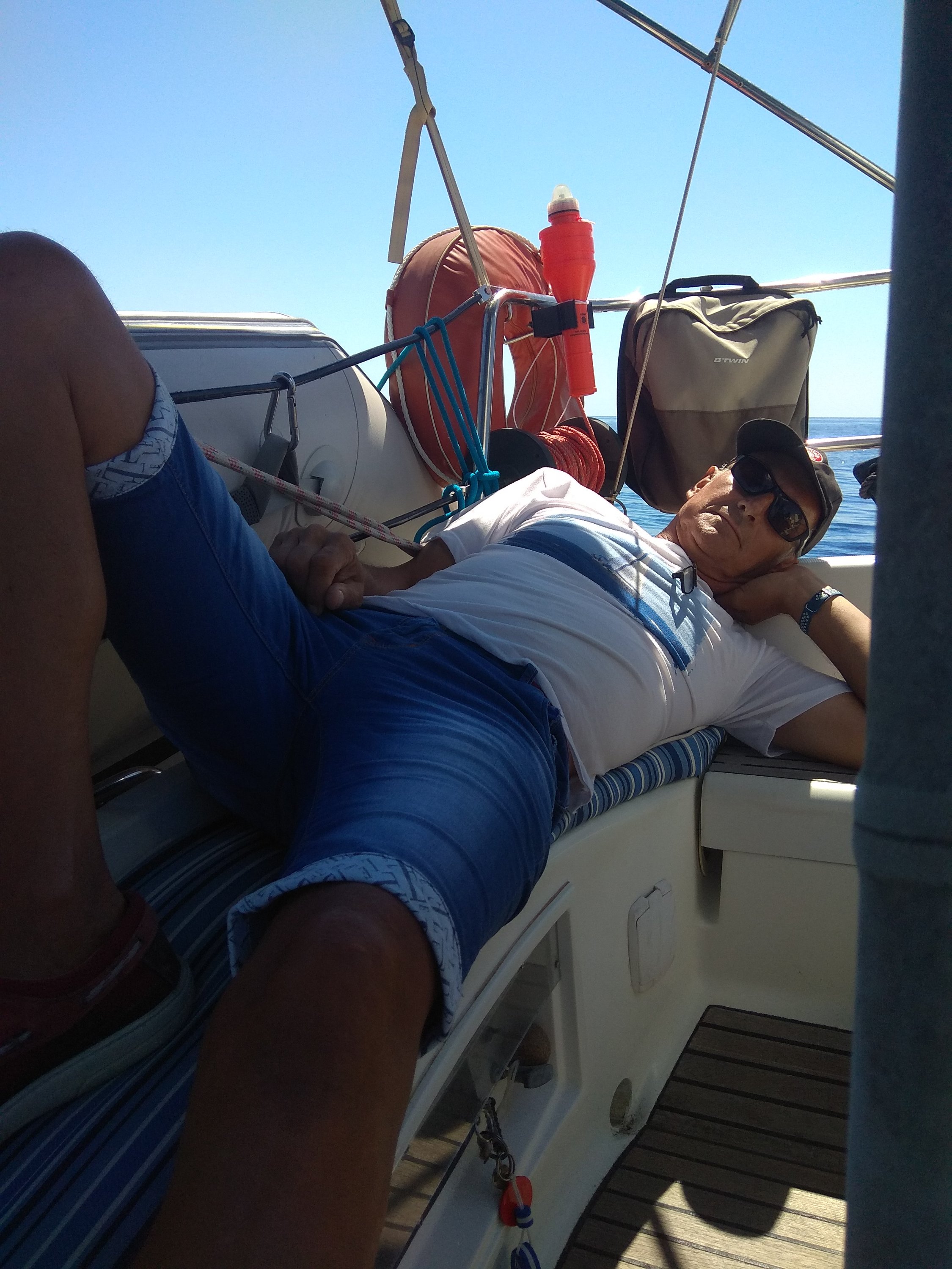It was a nice day but as you can see from the photos, very calm so once again we were motor sailing.  We had a very relaxing afternoon ….. one of us relaxed a little more than the other…..