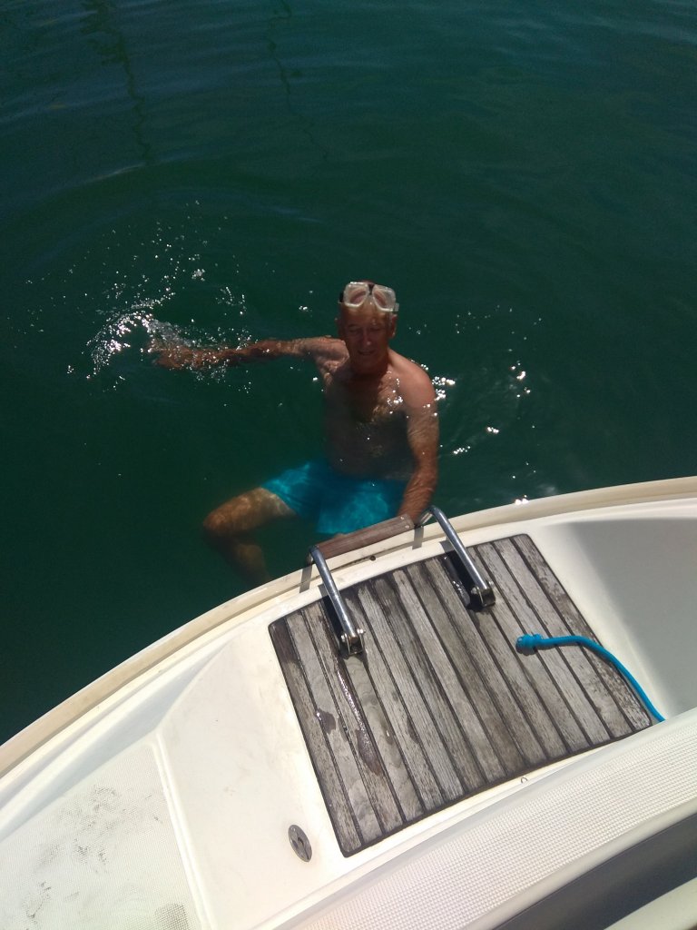 After saying that we were going to relax, we decided to take a quick look at our propeller under the boat.  We had a new bearing fitted in July and Skipper Nigel wanted to make sure everything looked good….
