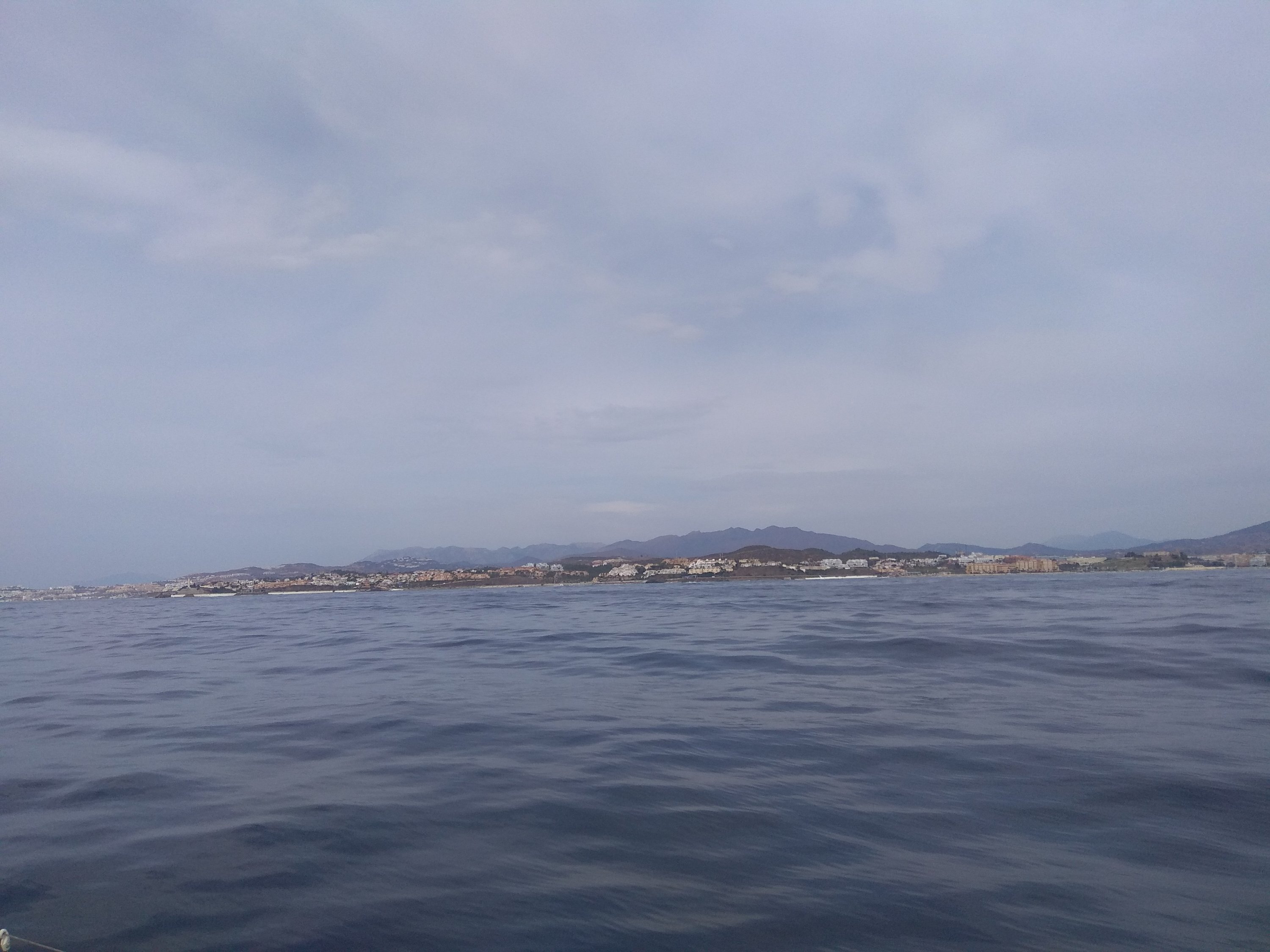 The next morning after a lovely sunrise we checked the weather forecast as usual and saw that there would be quite a swell. Once again we made our plans A (sail to Marbella), B (pull in at Fuengirola if conditions were too difficult), C (turn back if it was unbearable).  Skipper Nigel filled us up with fuel and off we went.  We did indeed encounter swell (not choppy waves) of around 1,5 – 2m but because it was behind us and there was no wind it wasn’t as bad as expected.  In fact we were on very low engine revs with some sail and we were being pushed along really fast.